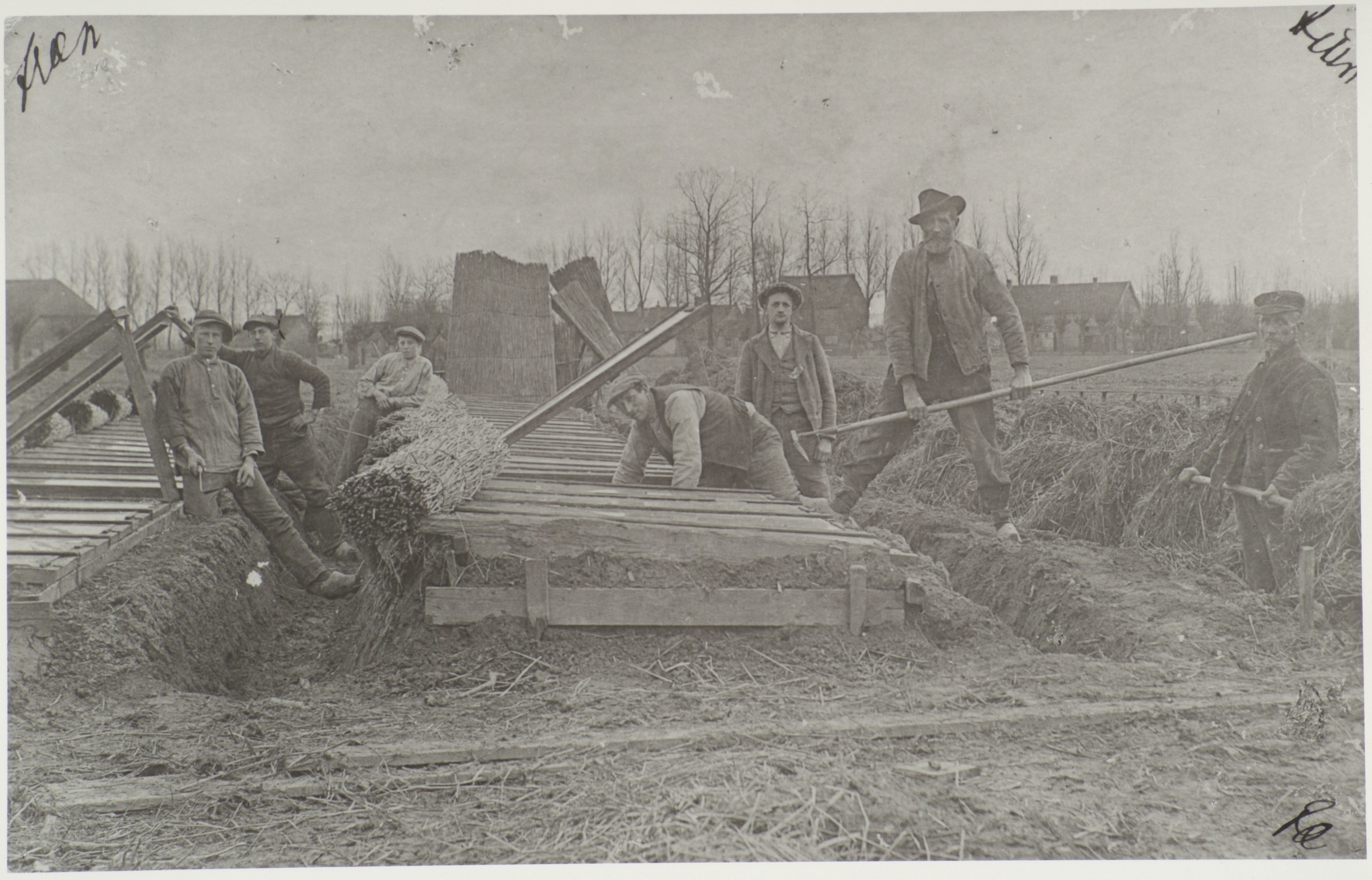- Arbeiders op een stuk landbouwgrond tussen Burgemeester Jaslaan en Oudendijk (achtergrond) in Dubbeldam. Op de achtergrond links boerderij Kerkzicht.