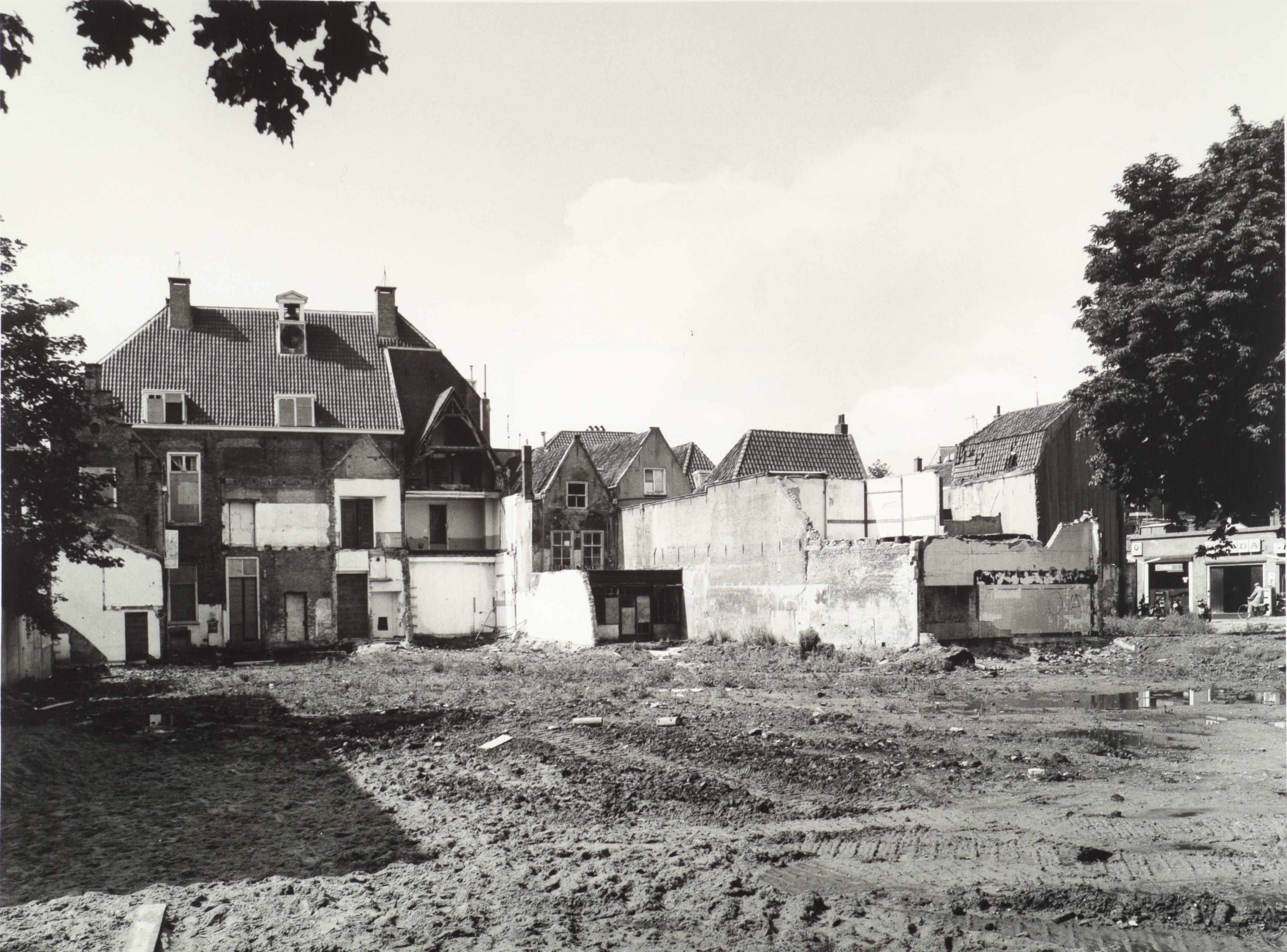 - Braakliggend terrein aan de achterkant van het Steegoversloot, gezien vanuit het Stek. Links de achterkant van het gerechtsgebouw, rechts de Doelstraat met motorhuis Vos.
