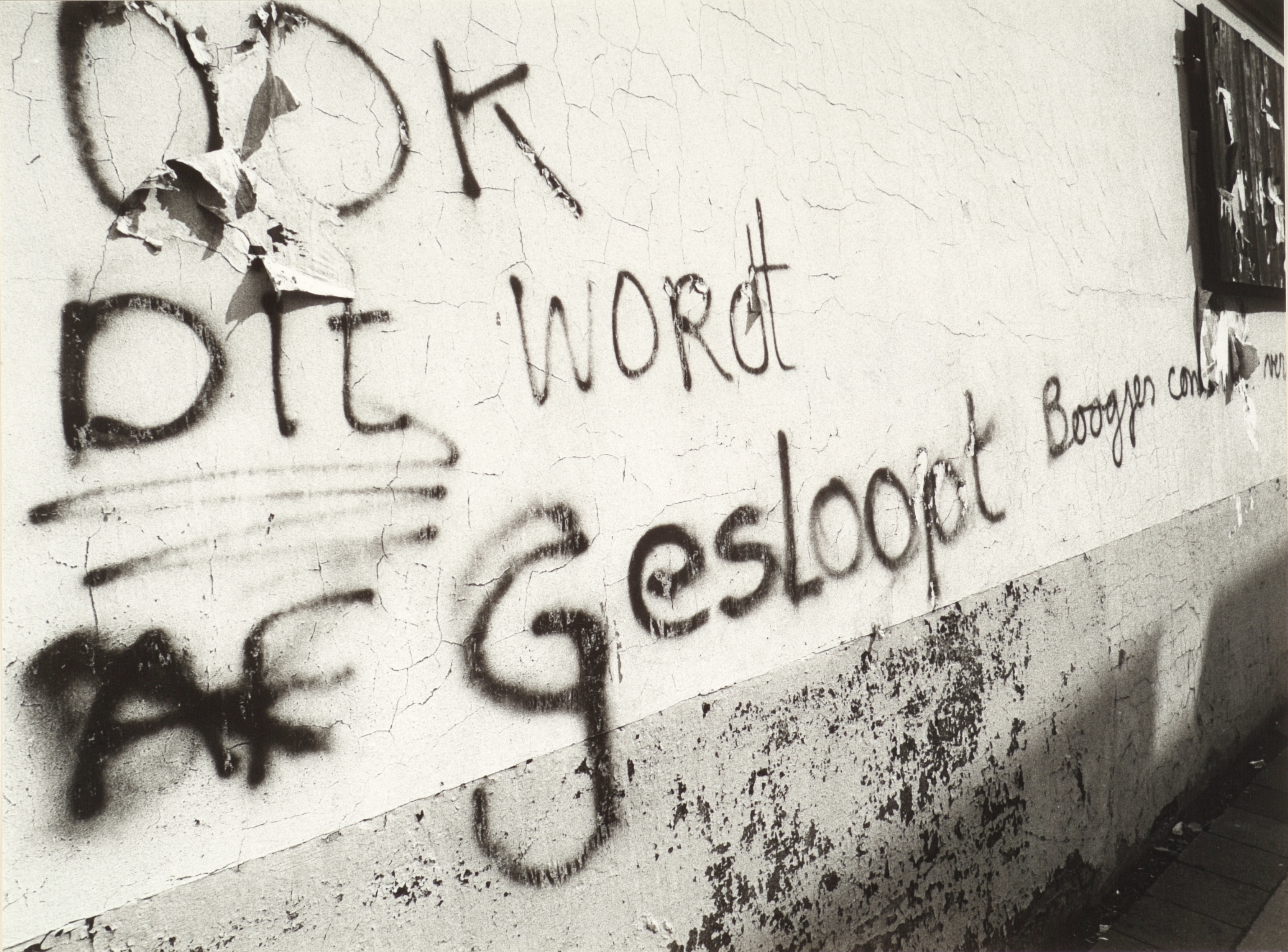 - Muur aan de noordzijde van het Slikveld met de tekst 'ook dit wordt gesloopt'.