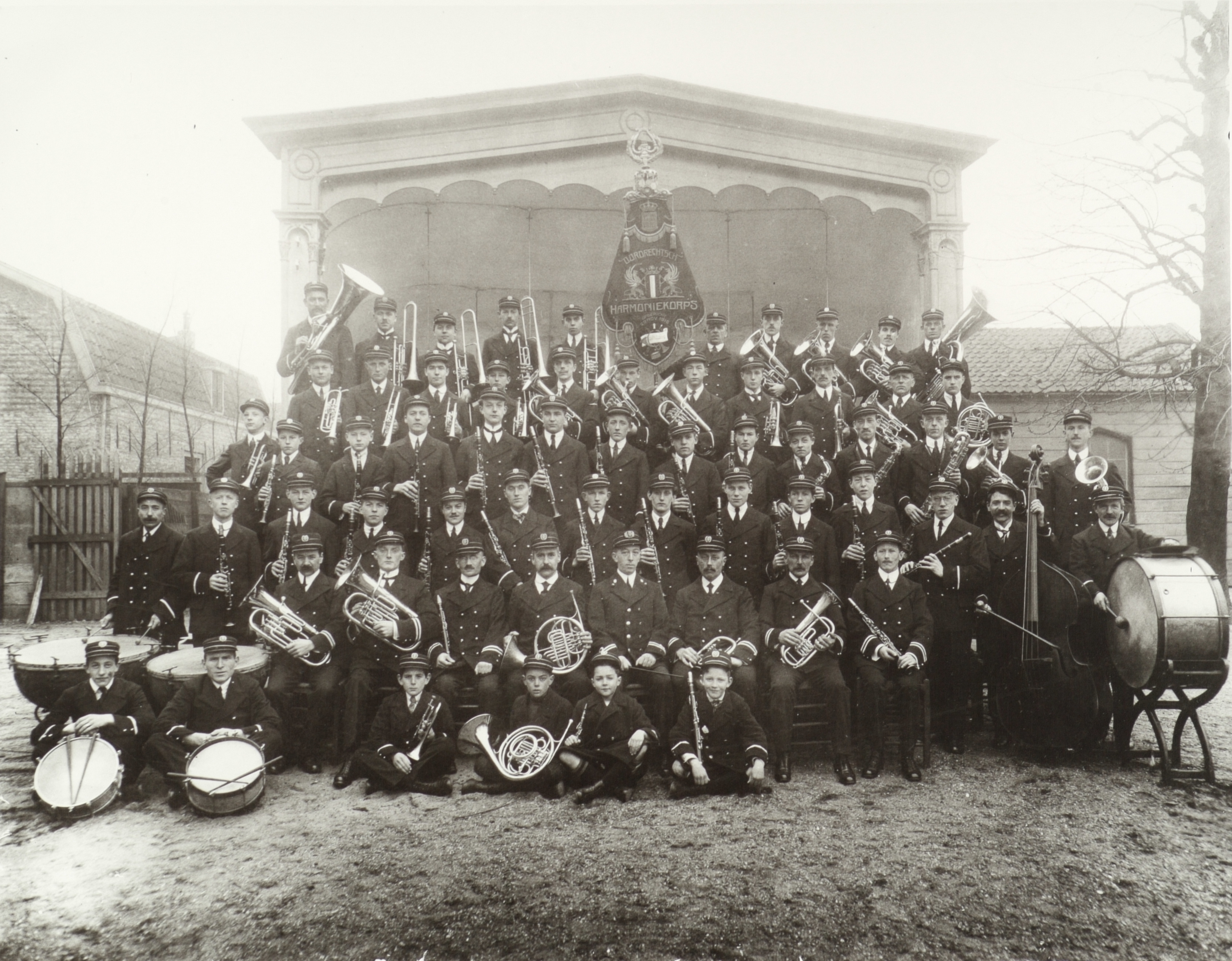 Groepsportret van het Dordrechtsch Harmoniekorps in de tuin van schouwburg Kunstmin aan …