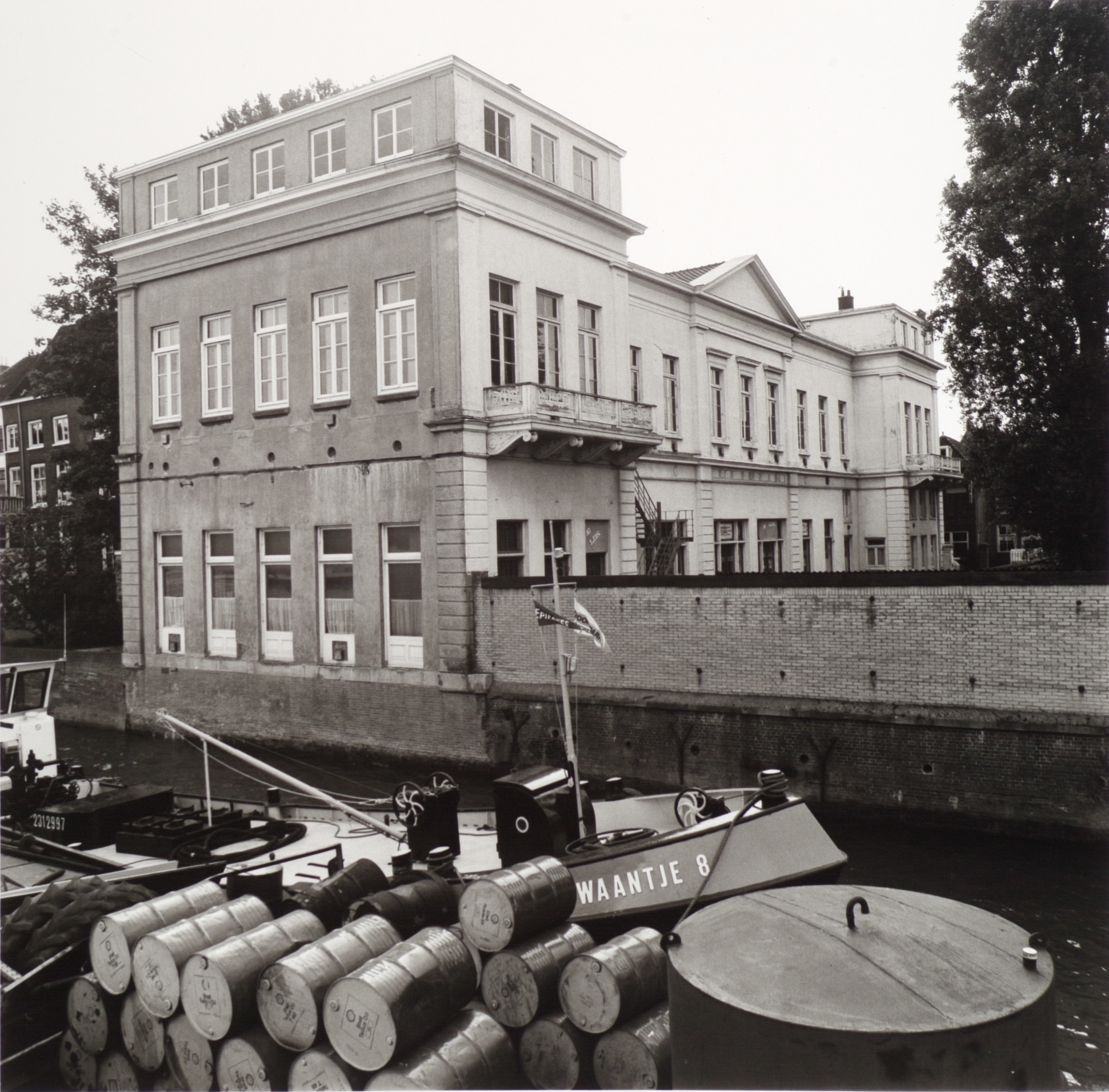Voormalige Sociëteit 'De Harmonie' aan Veersteiger, gezien van de de bunkerboot van Zwaans of vanaf een daar afgemeerd binnenvaartschip. Het bunkerbootje Zwaantje 8 ligt hier tussen wal en (bunker)schip.