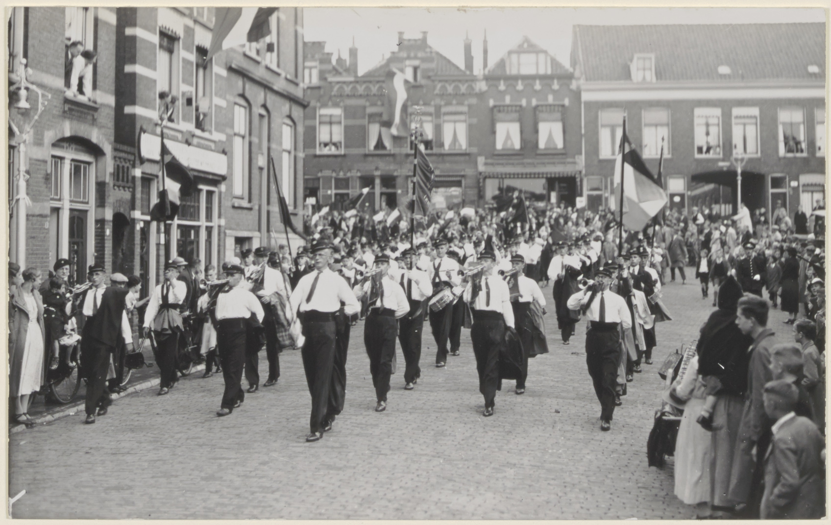 - Muziekkorps Jubal loopt vanaf de Noordendijk op het Kromhout. De poort rechts is de toegang tot het Krakerhof.