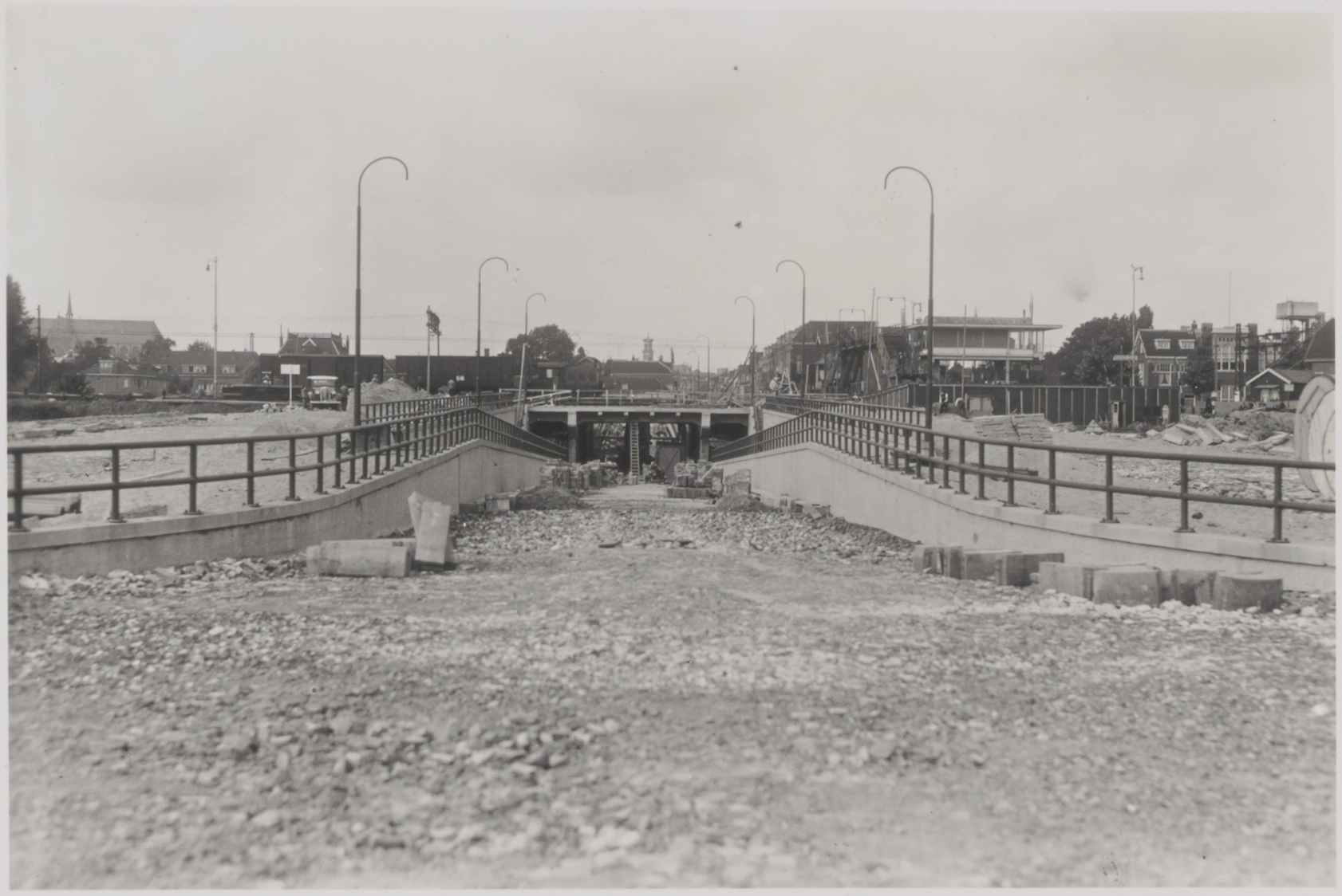 Bouw van de Krispijntunnel. gezien in de richting van de Spuiweg. Rechts van de tunnel de voetgangersbrug over het spoor en het seinhuis van de spoorwegen.