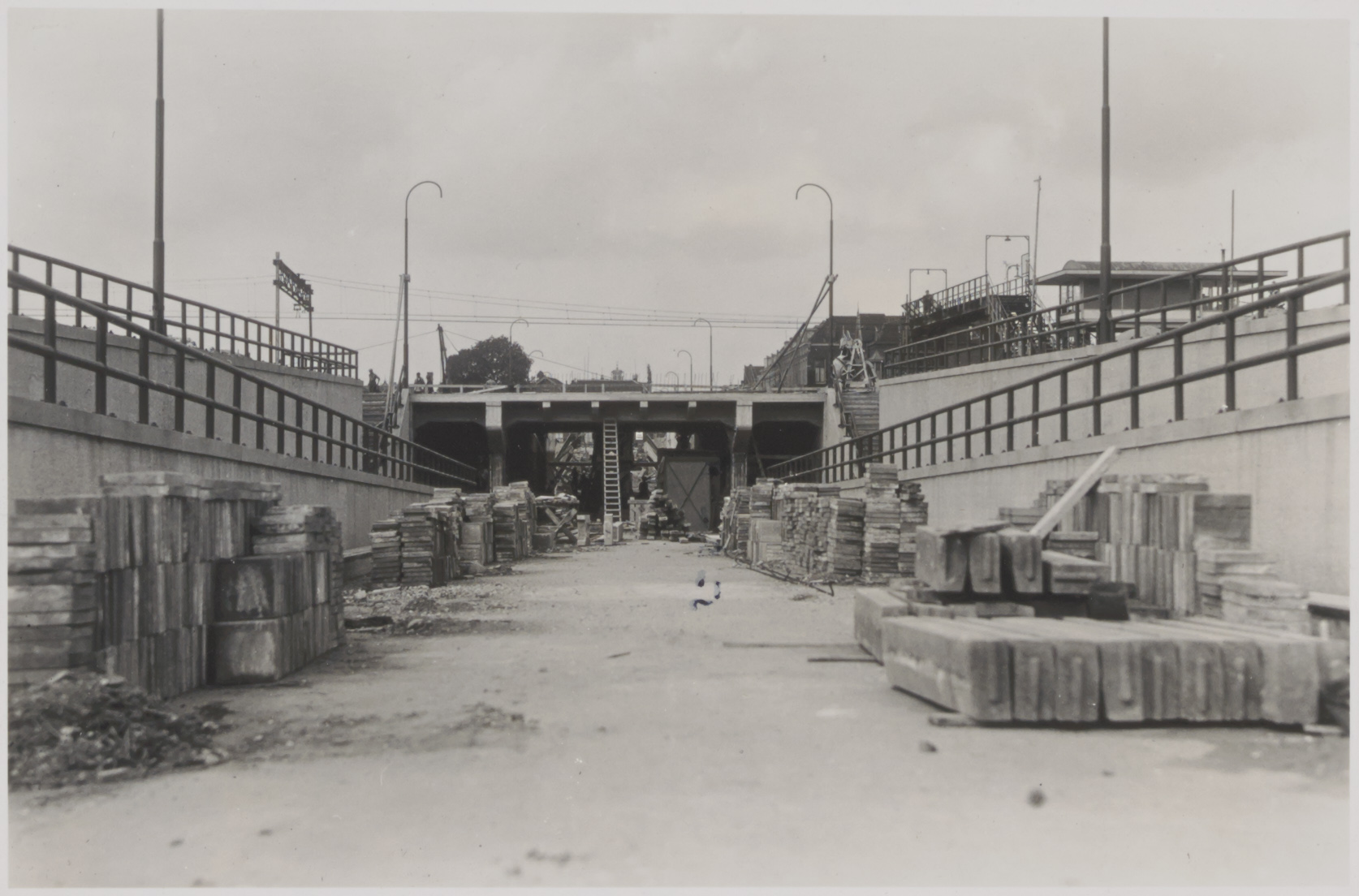 - Bouw van de Krispijntunnel, gezien in de richting van de Spuiweg. Rechts van de tunnel de voetgangersbrug over het spoor en het seinhuis van de spoorwegen.