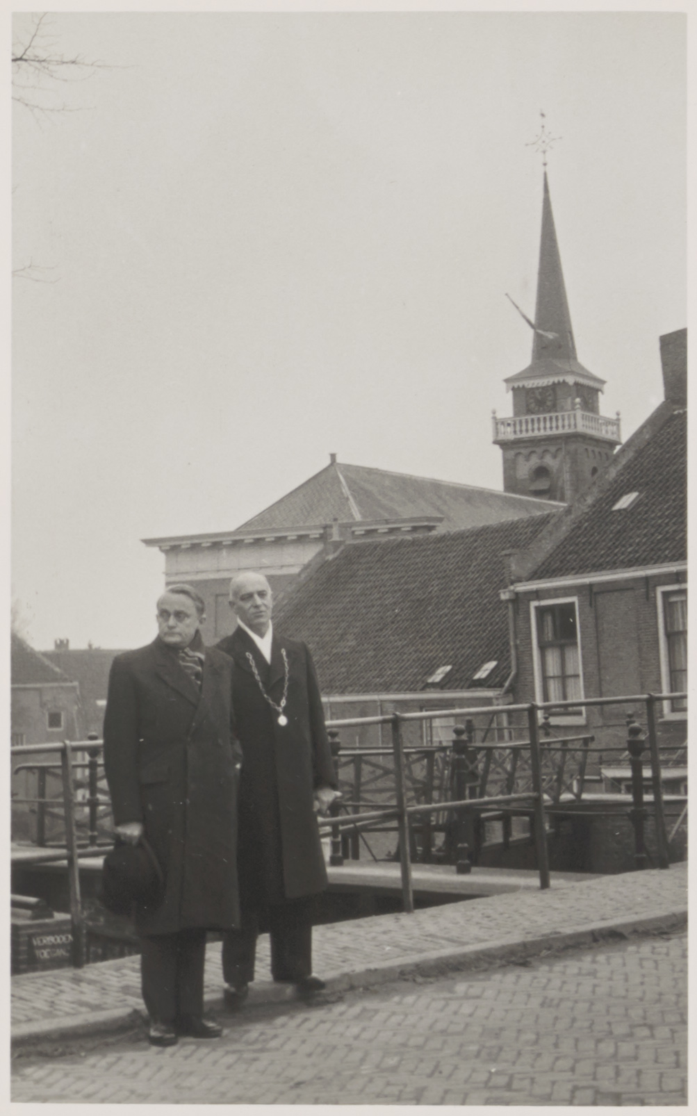 - Burgemeester W. van der Ploeg op de brug over de Boezemvliet in Puttershoek. Op de achtergrond de Nederlands Hervormde Kerk aan de Boezemkade.