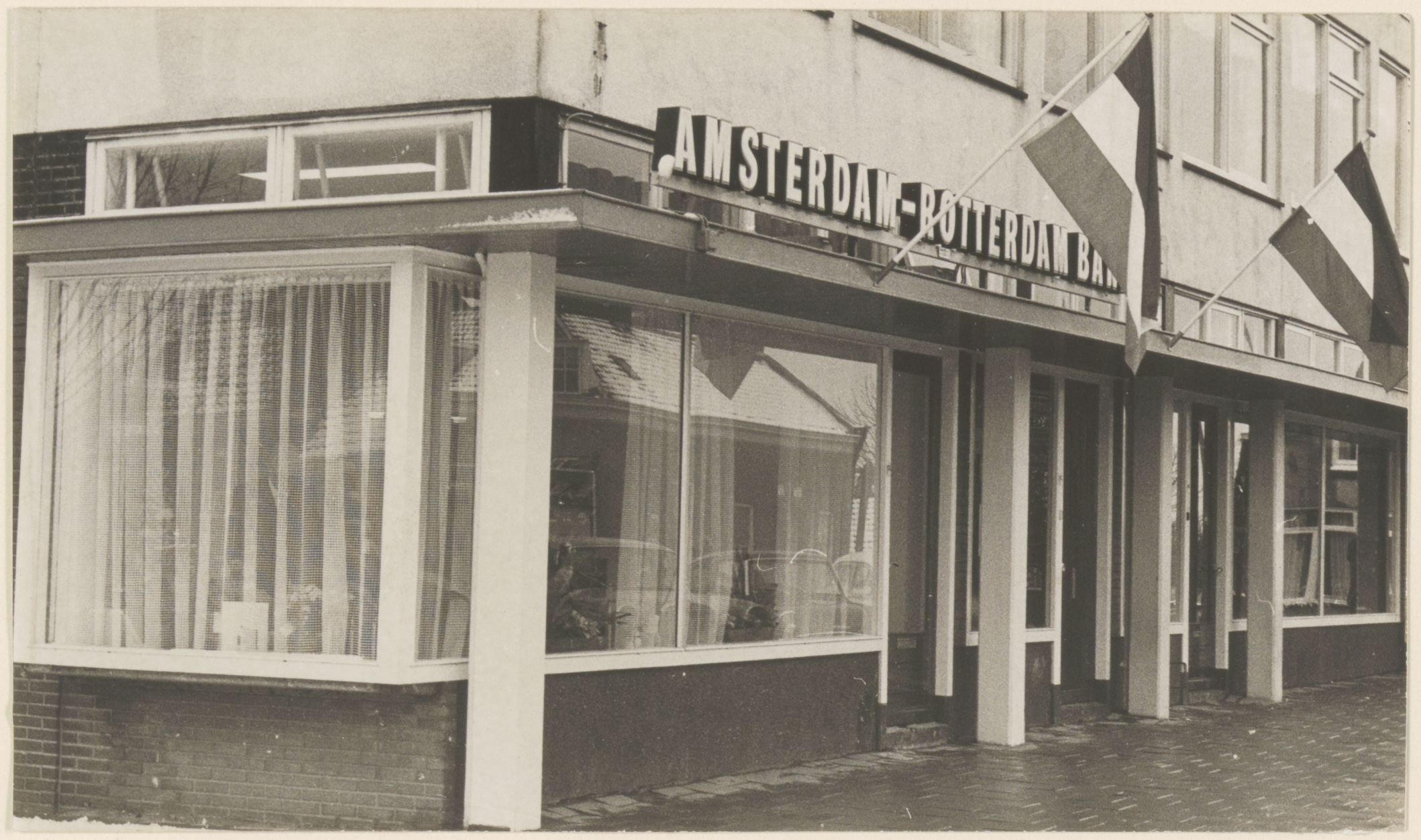 Het nieuwe, op 6 februari 1968 geopende filiaal van de Amro-bank aan de Eilandstraat 1 te Papendrecht.