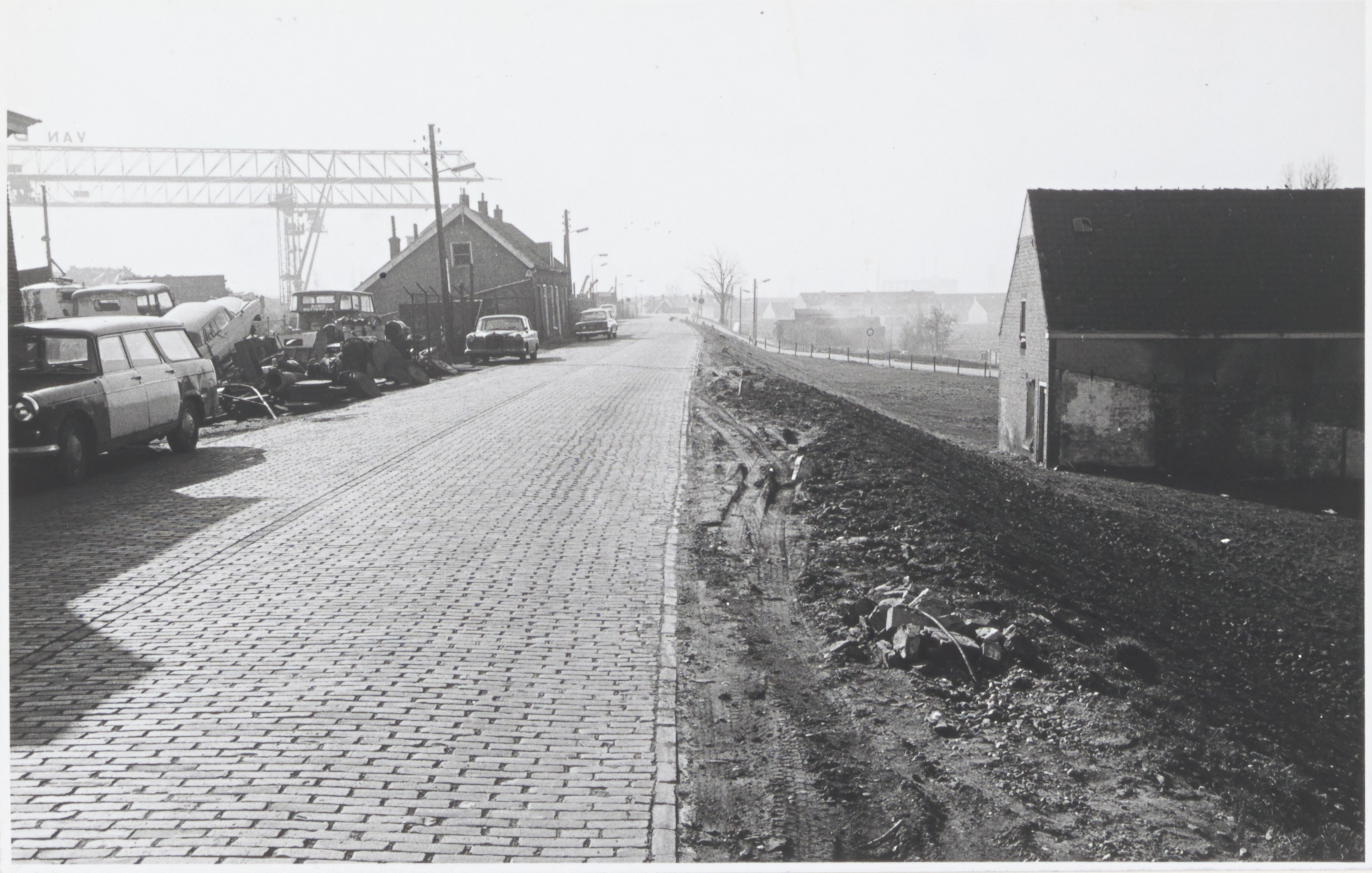 We kijken richting Zwijndrecht en zien links de portaalkraan van Van Dalen's scheepssloperij en metaalhandel aan de Veersedijk 299 in Hendrik-Ido-Ambacht. De vrachtwagencabine het dichtst bij de rijweg is van een Henschel van König uit Rotterdam.
