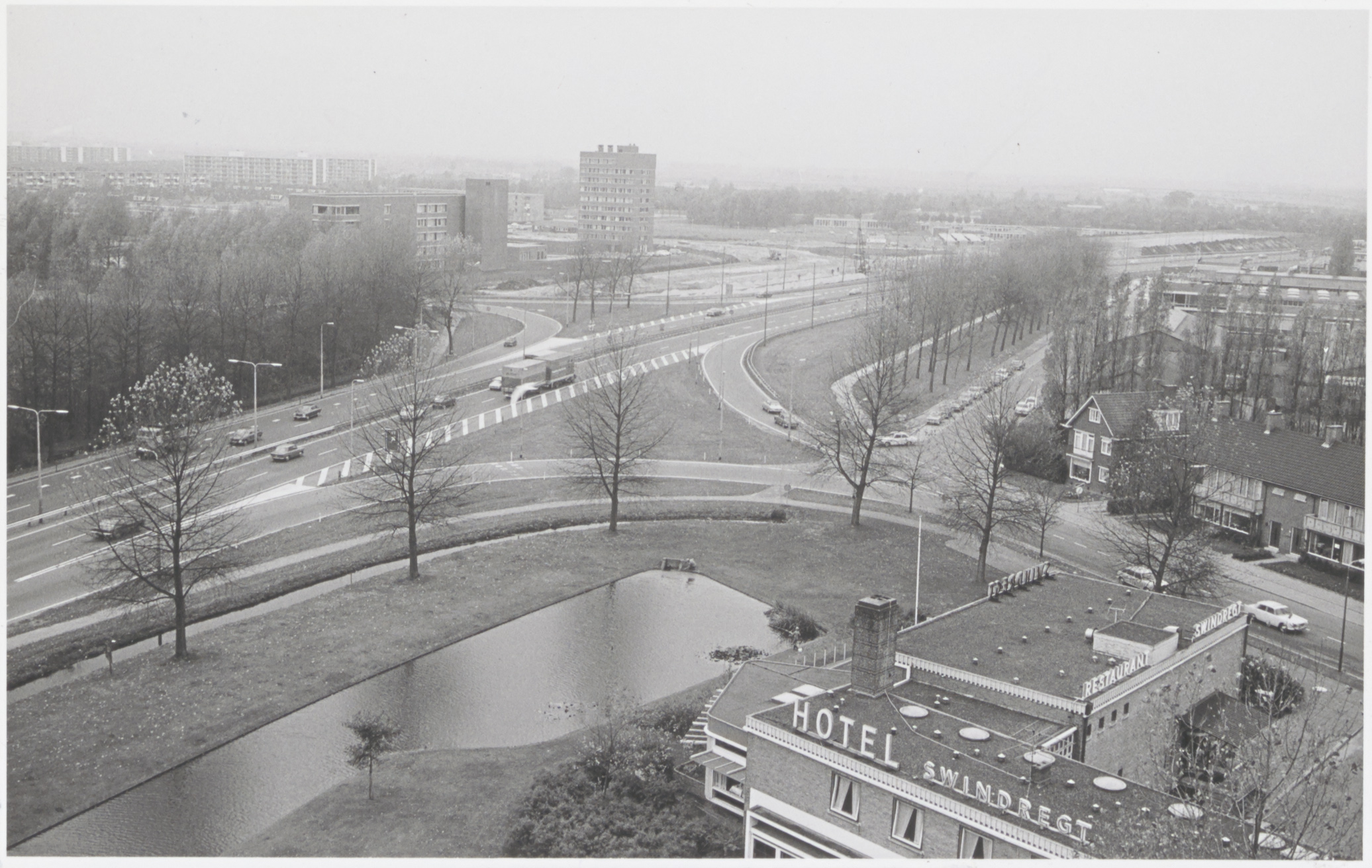 - Hotel Swindregt aan de Pieter Zeemanstraat in Zwijndrecht. Links de snelweg A16.