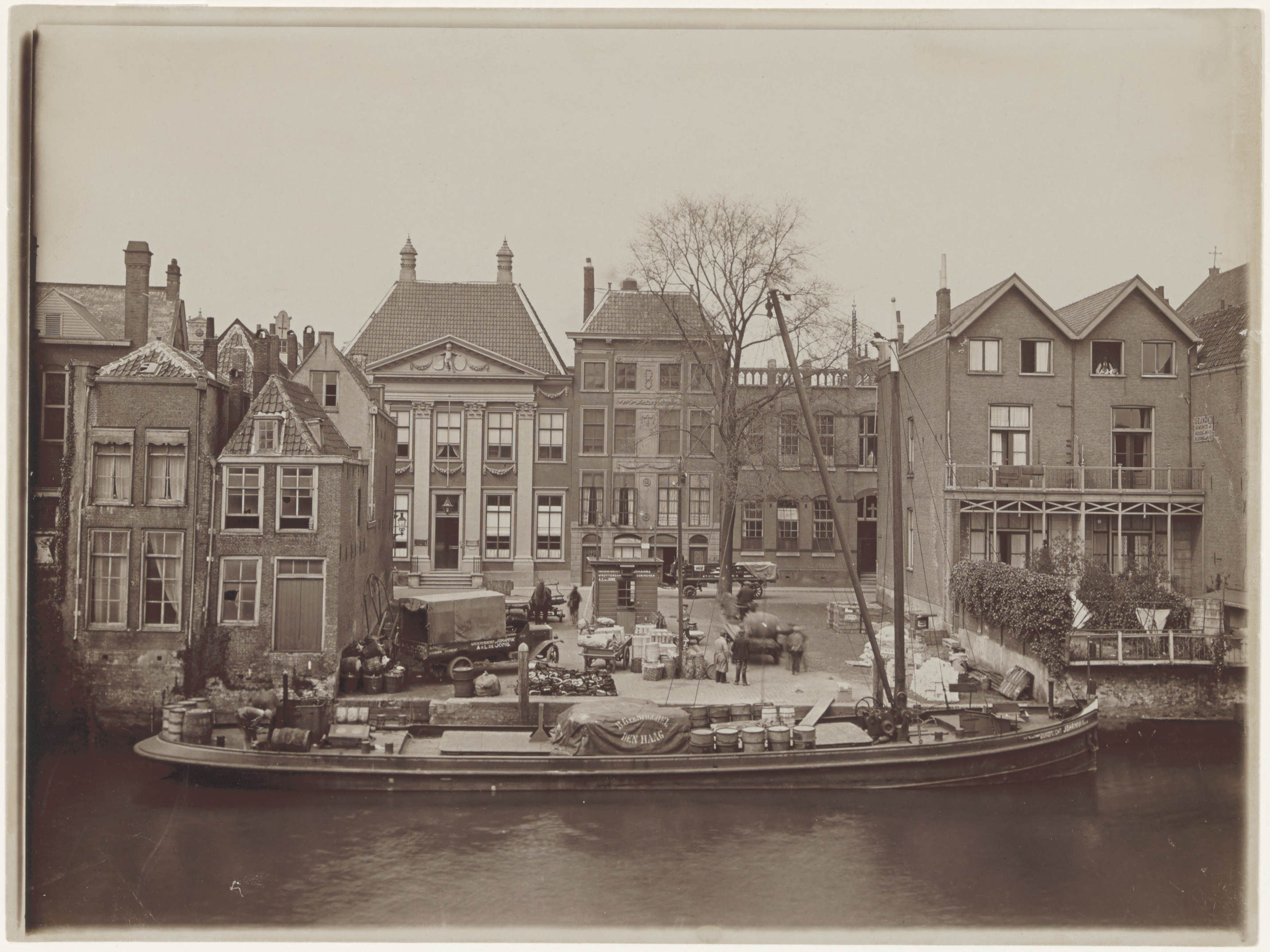 Zicht over de Wijnhaven op de Kraansteiger en de Wijnstraat. Van de drie panden in de Wijnstraat is Huis De Onbeschaamde links en de RK school rechts te zien.