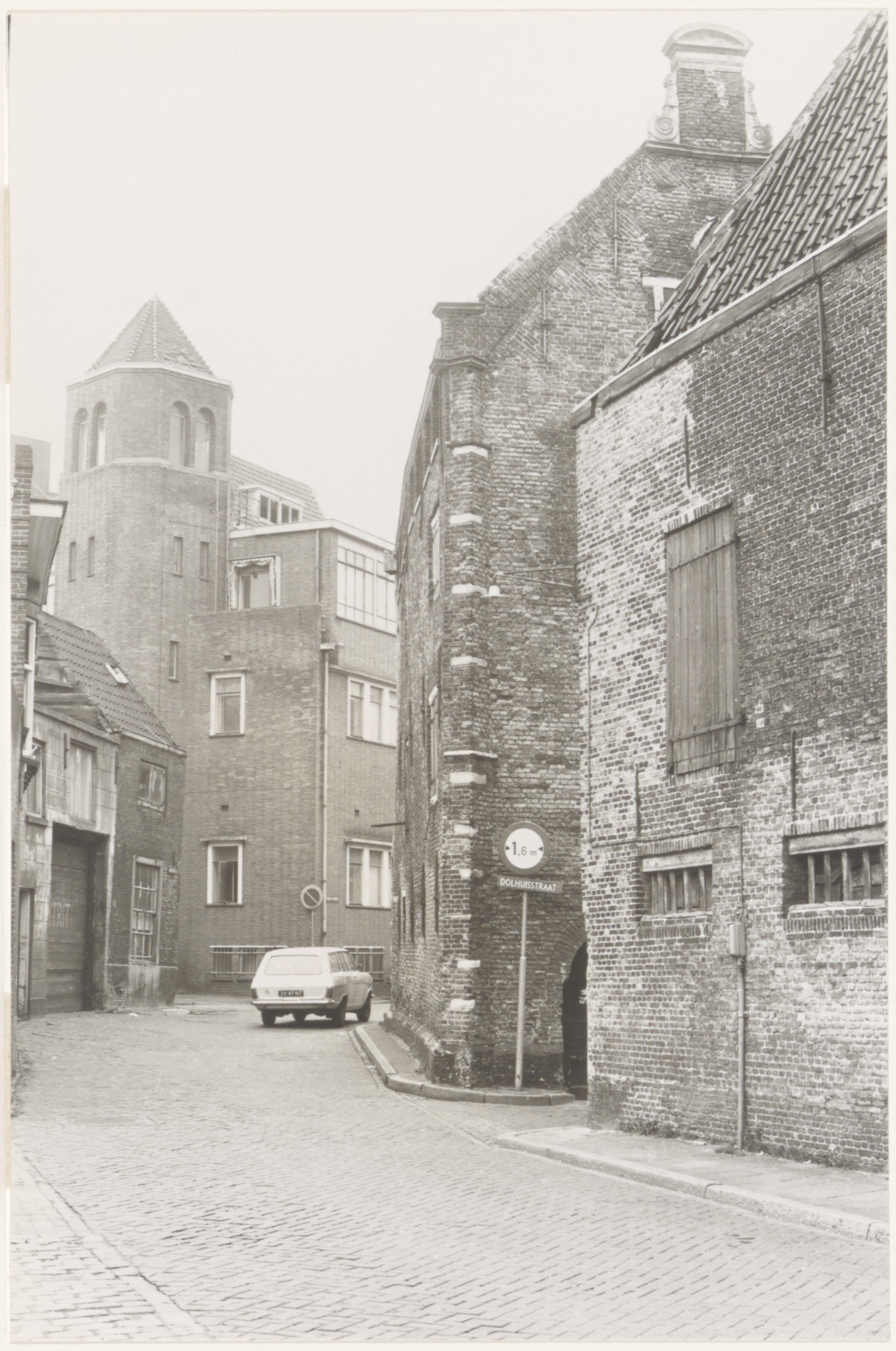 - Vanaf de Boogjes een blik richting Dolhuisstraat met het Dolhuys; verderop het Diaconessenhuis op de hoek Slikveld (bij de auto naar links) - Suikerstraat.