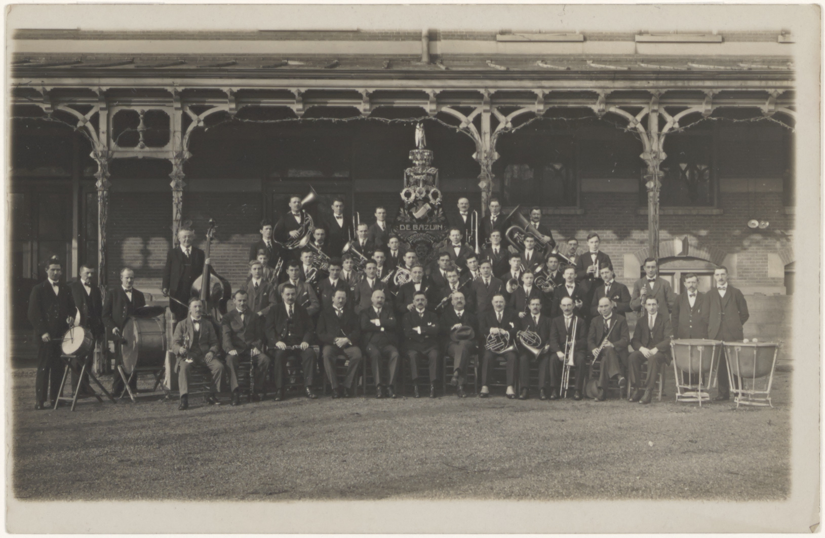 - Muziekkorps De Bazuin poseert in de tuin van Kunstmin.
