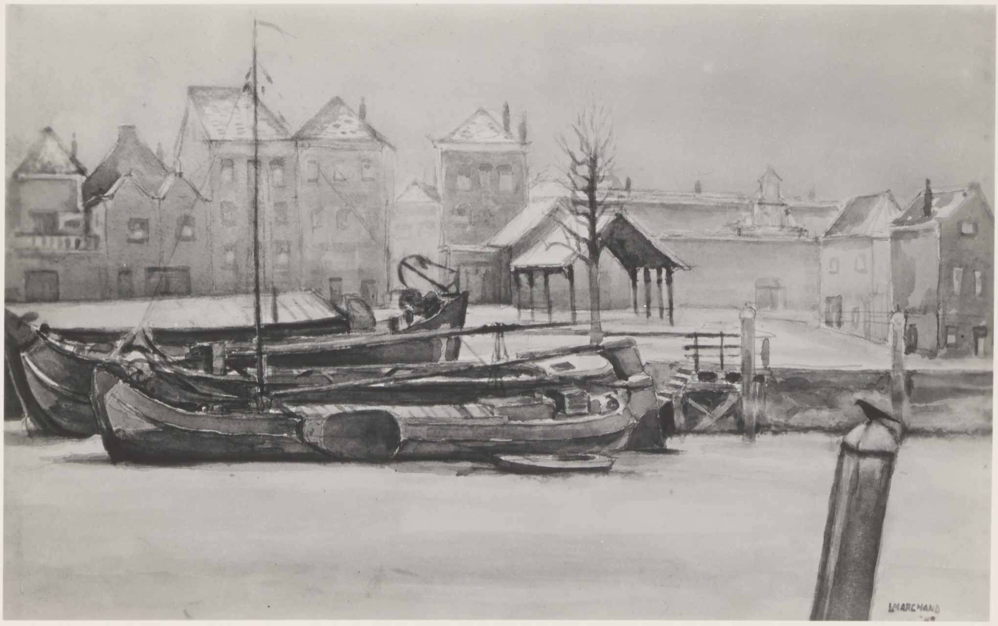 - Schilderij van L. Marchand van de Vismarkt, gezien over de Nieuwe Haven.