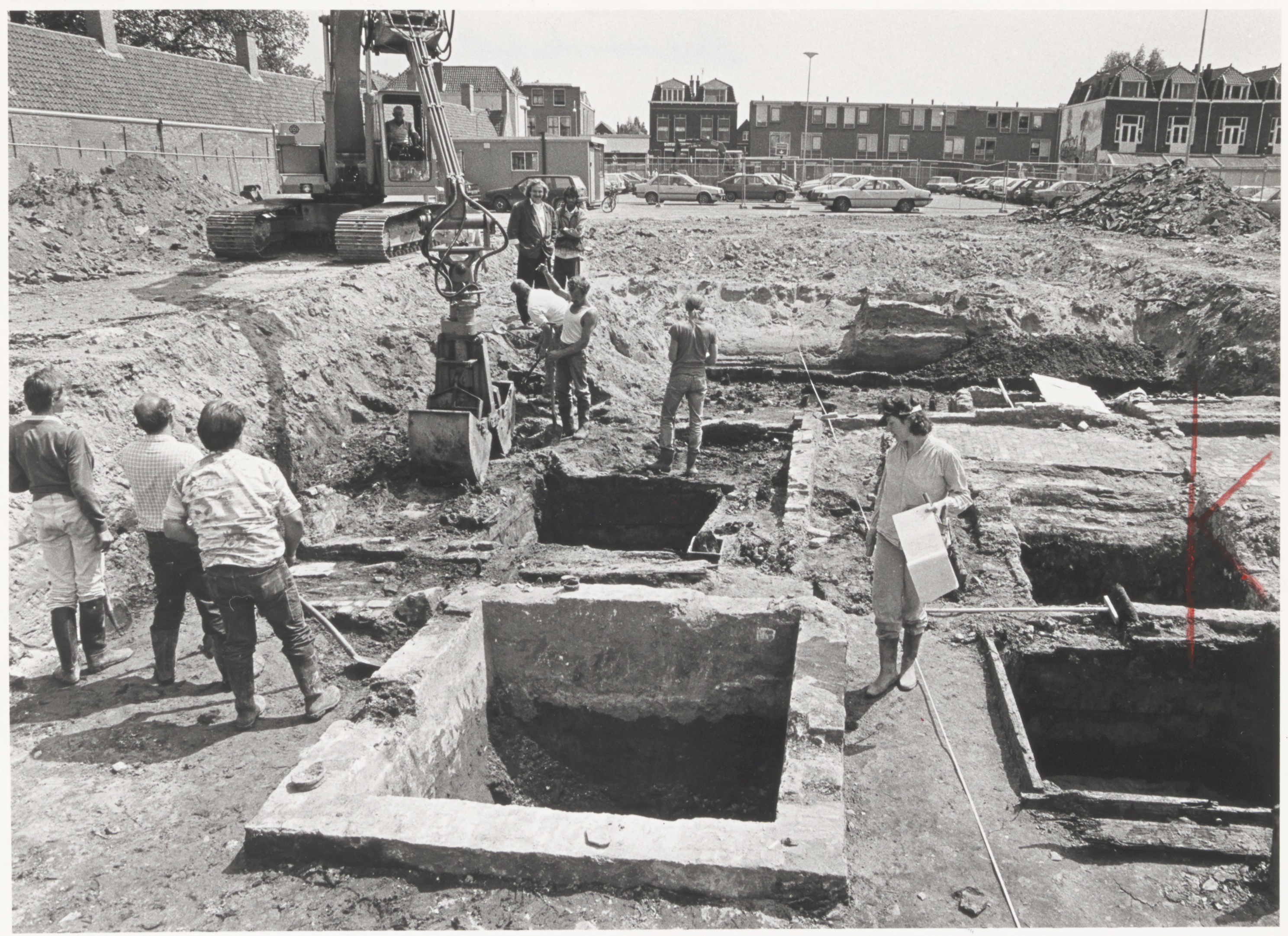 Opgraving van leerlooijeren door toen de Rijksdienst voor het Oudheidkundig Bodemonderzoek (ROB) onder de dagelijkse leiding van veldtechnicus Arnold de Haan (middenop de foto met staart).