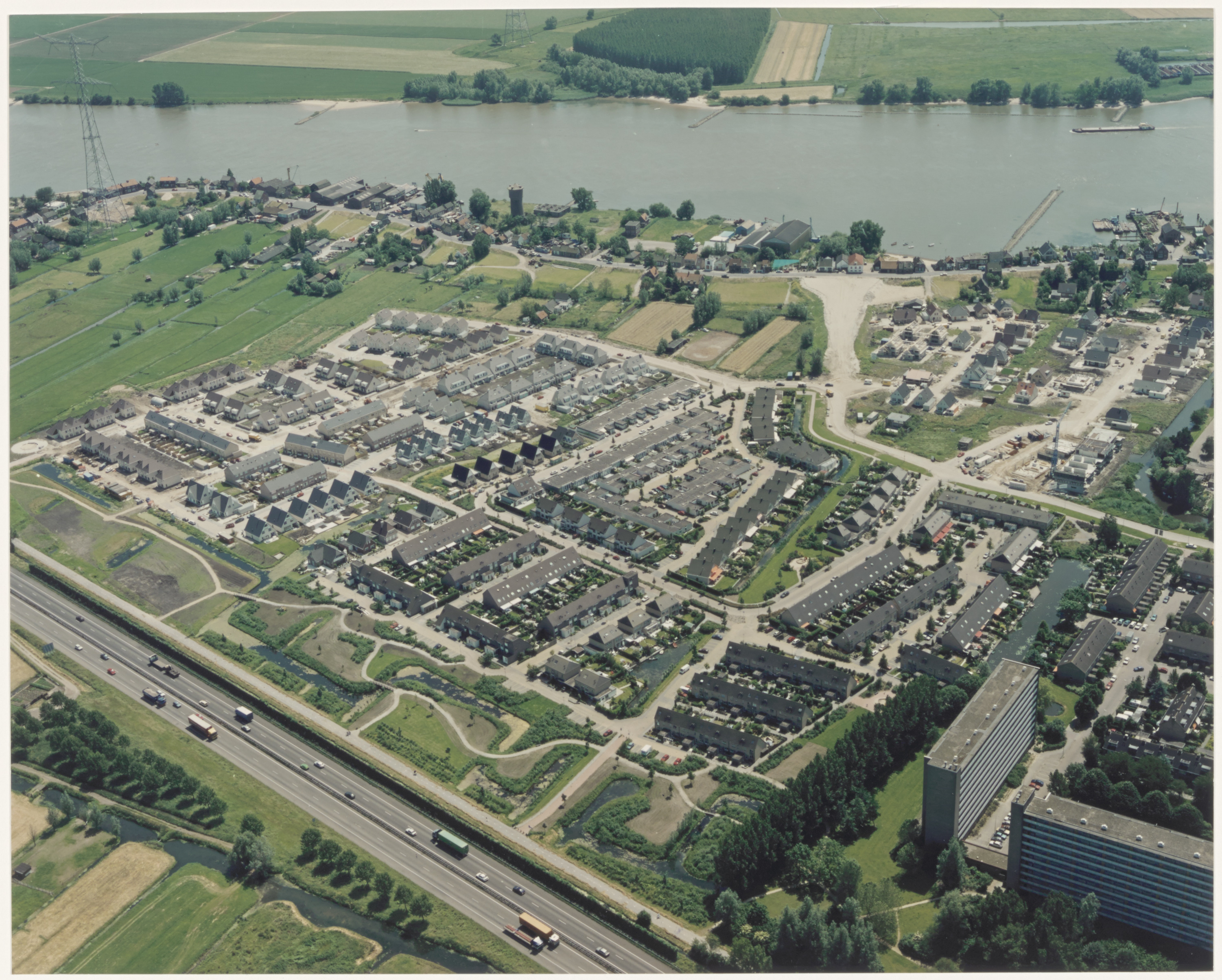 - Luchtfoto van het oostelijk deel van Sliedrecht, naar het zuiden gezien. Onder de A15 en boven de Merwede. Rechts van het midden loopt de Thorbeckelaan naar de Rivierdijk.