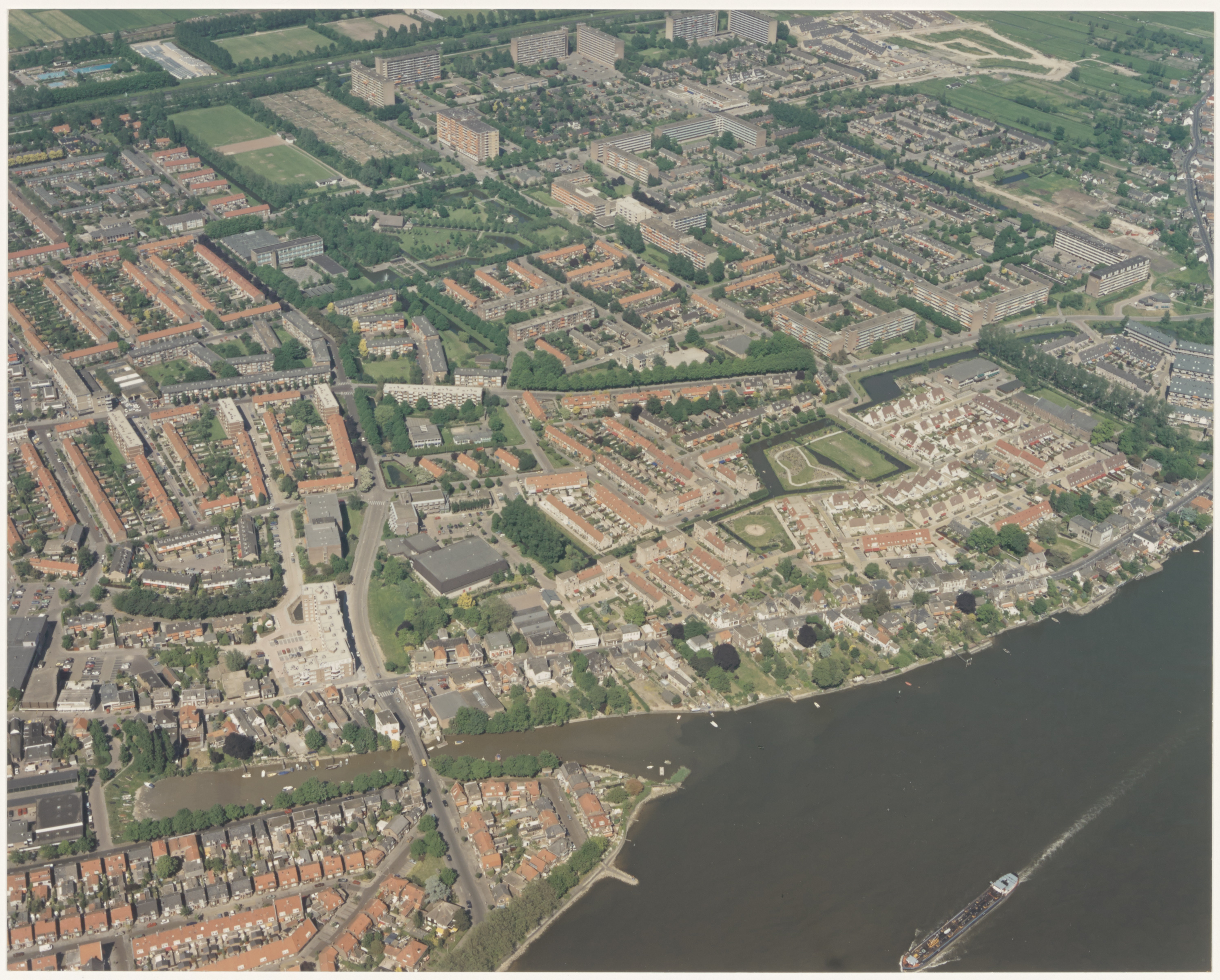 Luchtfoto van Sliedrecht vanaf de Rivierdijk langs de Merwede naar het noordoosten.