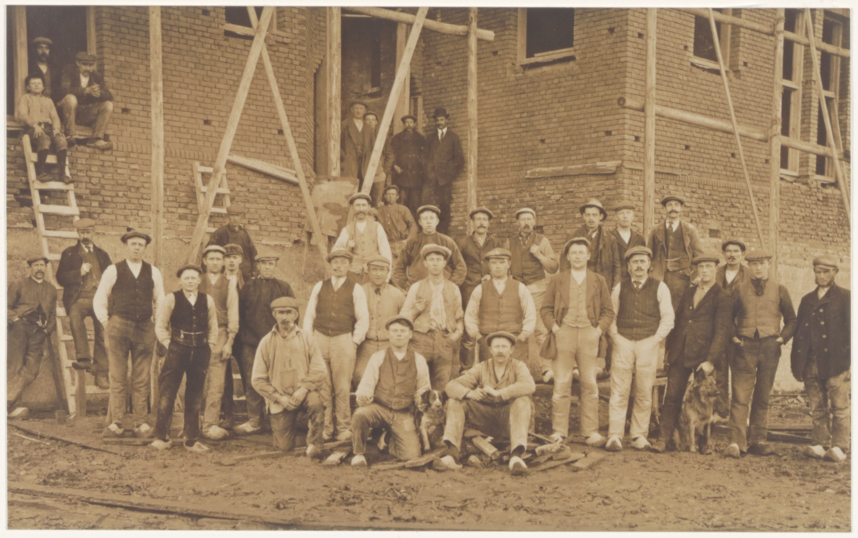 bouwvakkers, arbeiders (op klompen) bij gebouw in aanbouw (ladders)