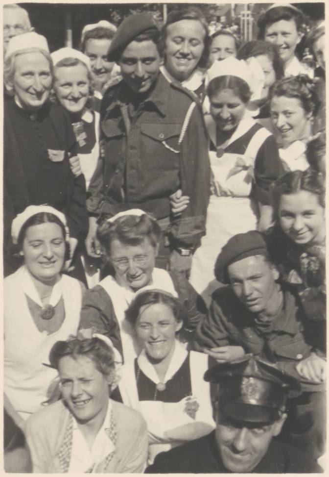 Verpleegsters en militairen tijdens de bevrijding van de Tweede Wereldoorlog bij het …