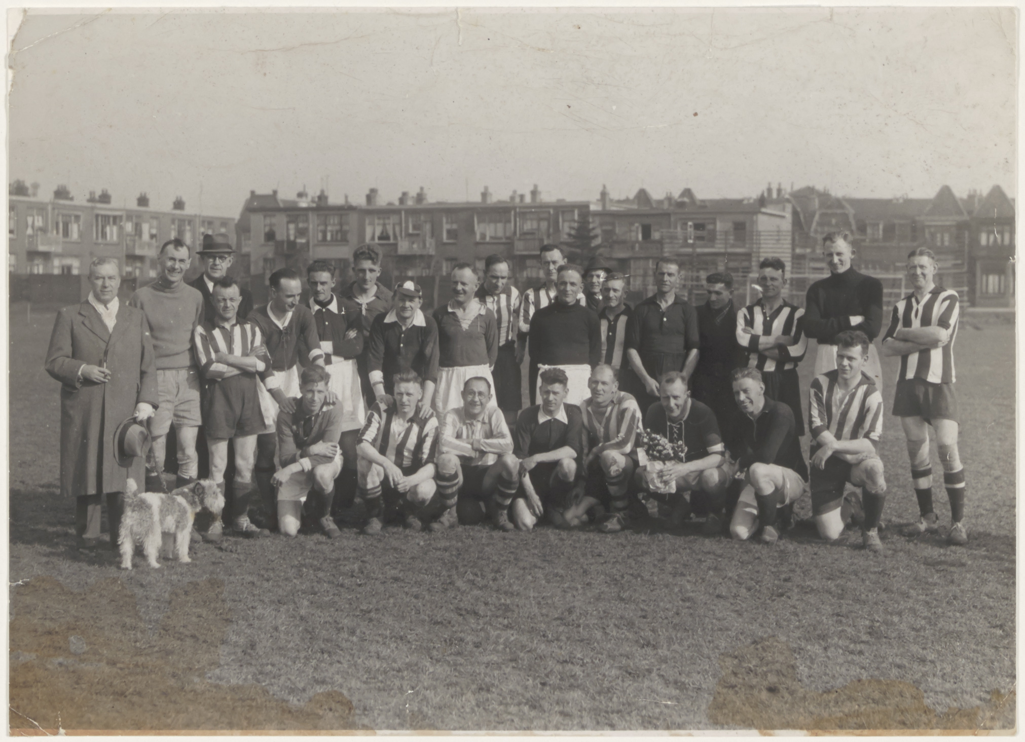 Veteranenelftallen van DFC en DMC op het DFC-terrein aan de Mauritsstraat. Staande …