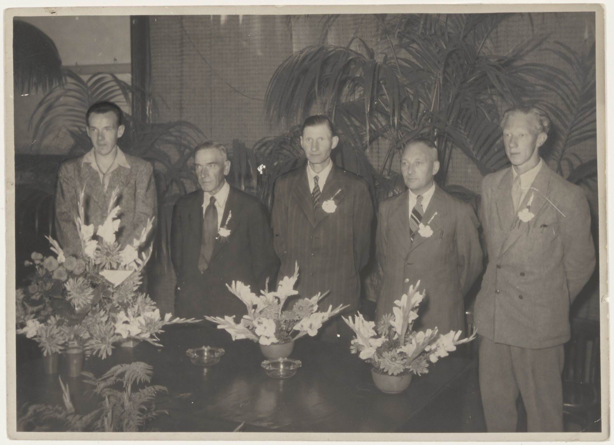 - Bestuur van postduivenvereniging De Luchtbode bij het 25-jarig bestaan. V.l.n.r. B.A. Venus, C. Hofwegen, J. Holster, J. Peters, P. v.d. Merwe.