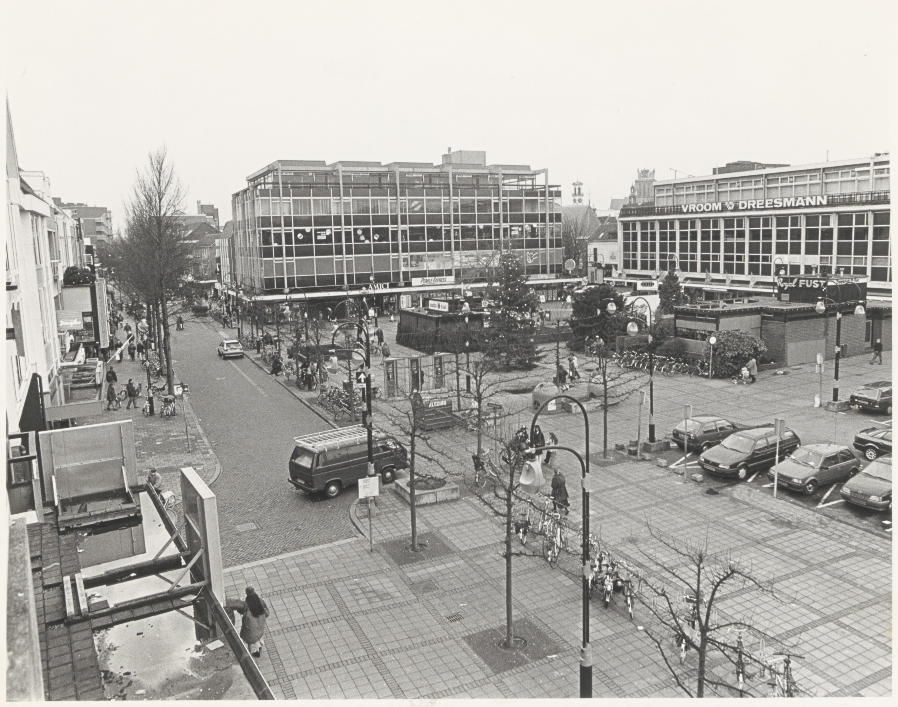 - auto's fietsenrekken / fietsenstallingen kiosken lantaarns / straatverlichting parkeerplaatsen warenhuizen winkelend publiek