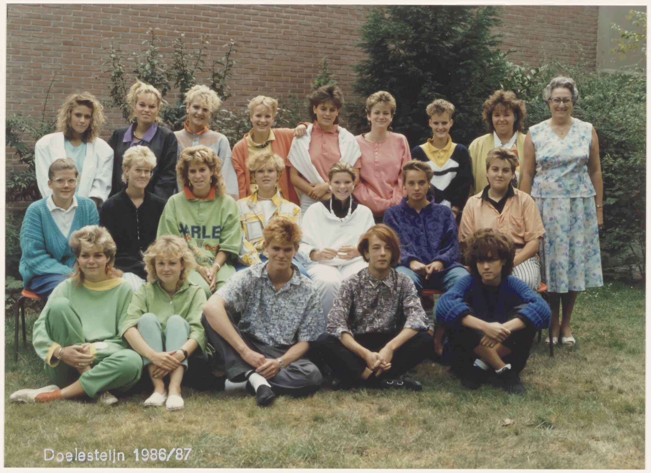 Klassenfoto van de Industrie- en Huishoudschool Doelesteyn in het leerjaar 1986/1987.