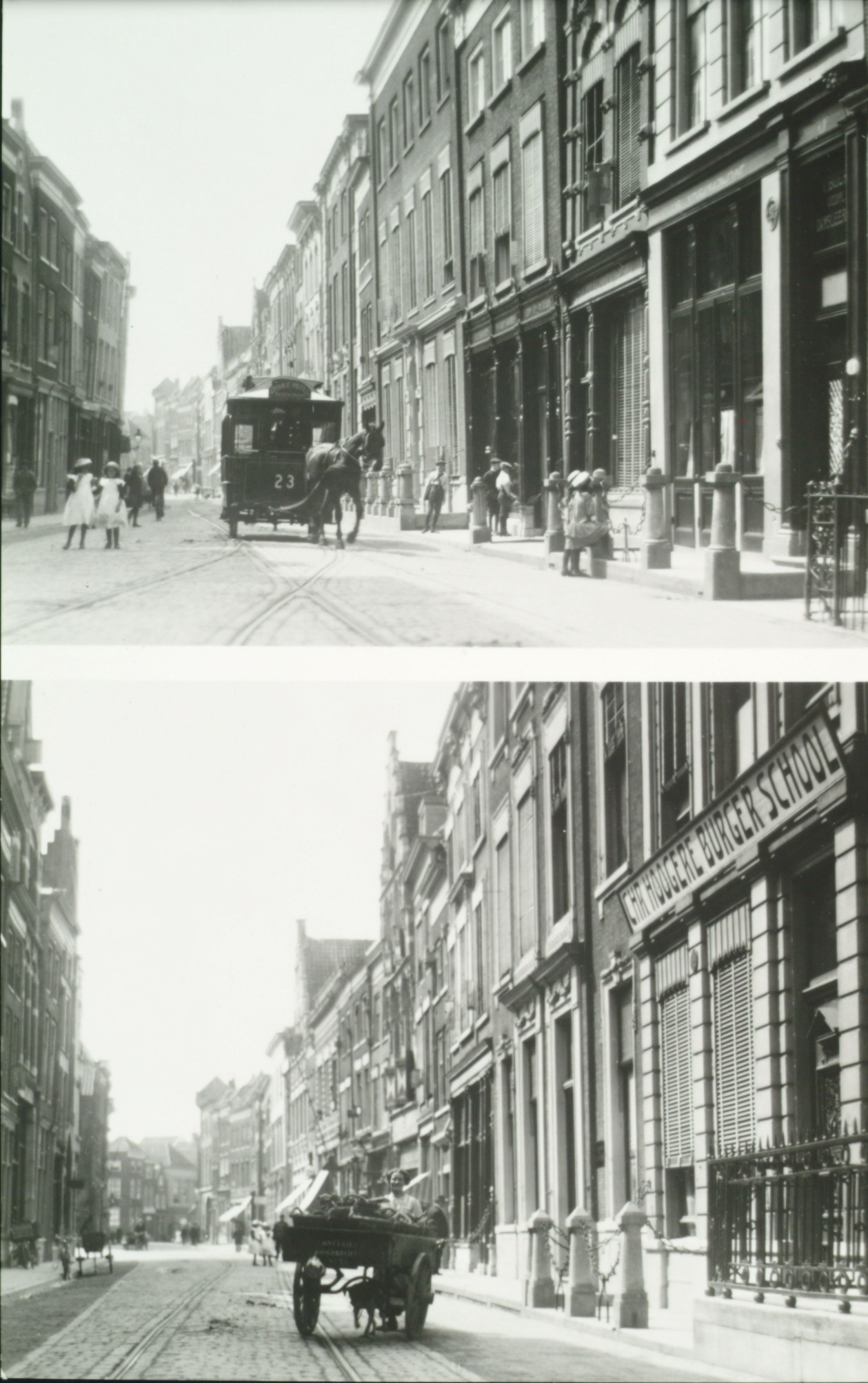 - Boven: Groenmarkt vanaf het Scheffersplein richting Visbrug. Onder: Groenmarkt vanaf de Christelijke HBS in de Wijnstraat in de richting van de Visbrug.
