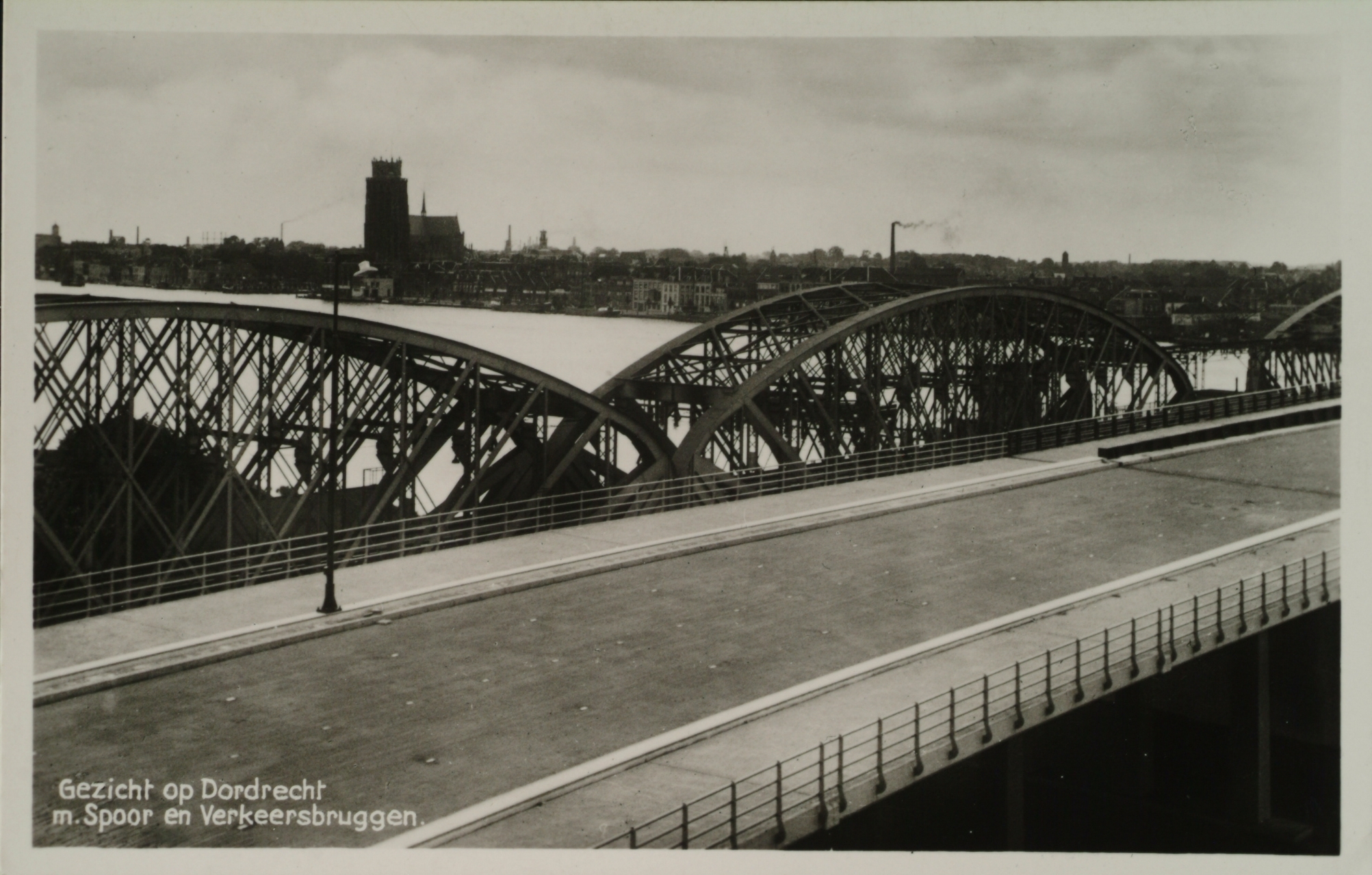 - In aanbouw zijnde verkeersbrug naast de spoorbrug over de Oude Maas, gezien richting Dordrecht. Op de achtergrond de Grote Kerk.