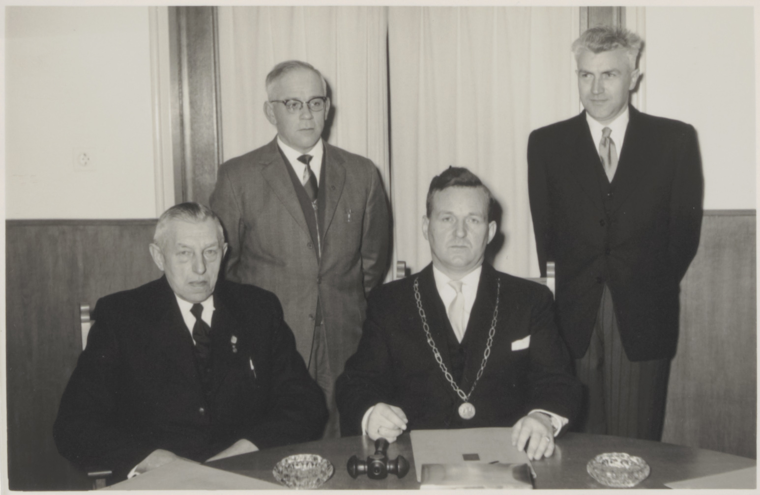 - Wethouder A. van Mourik, secretaris M. Bouter. Staand wethouder J.C. de Haan en burgemeester H.H. Zwart van Bleskensgraaf