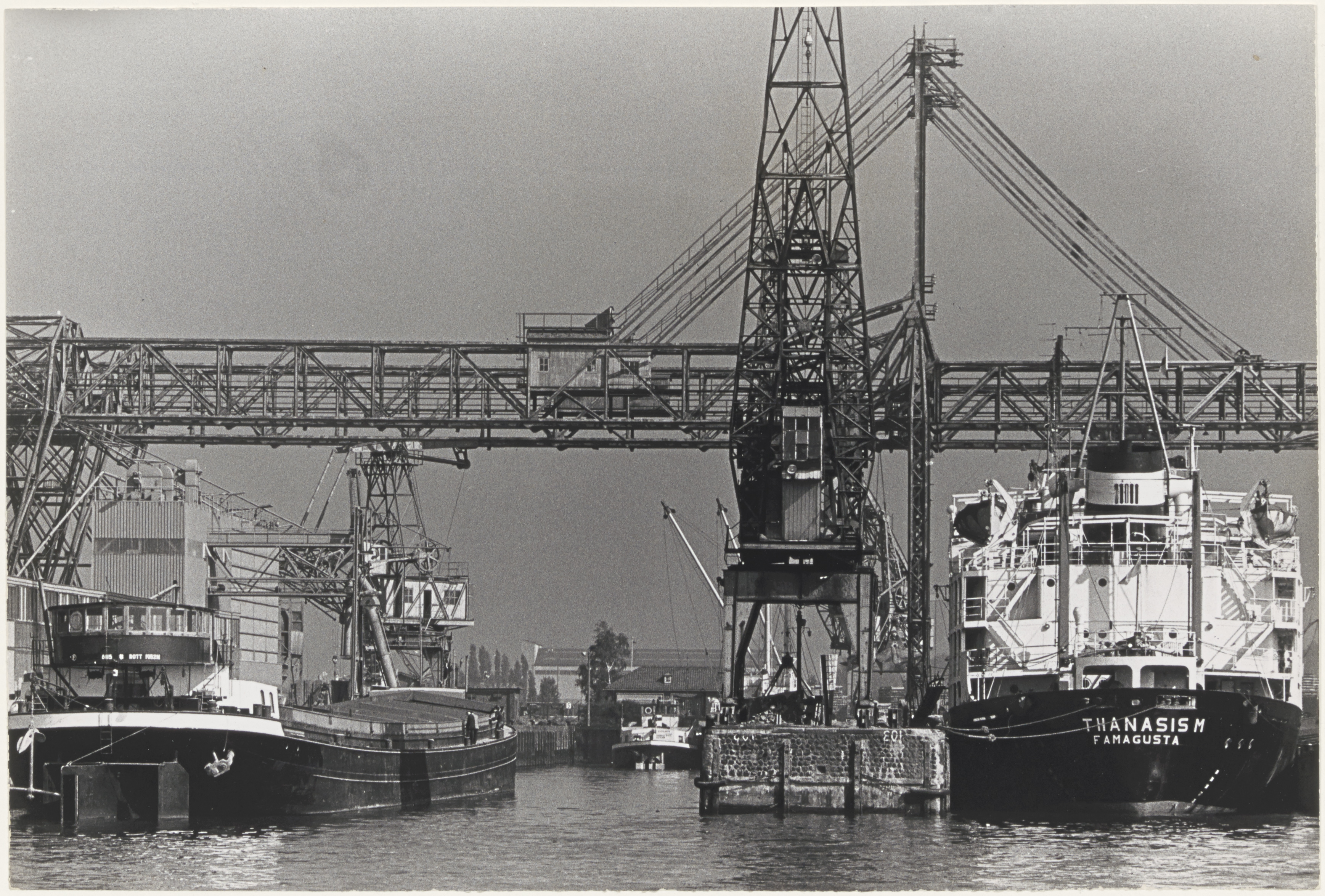 Rechts van het midden, de uit caissons opgebouwde pier op de kop gezien. Aan de buitenkant van de pier het op de State Dockyard te Newcastle, Australië gebouwde vrachtschip welk in 1982 werd gesloopt. Nog 2 van de oorspronkelijk 4 brugkranen aanwezig. Periode 1970-1972