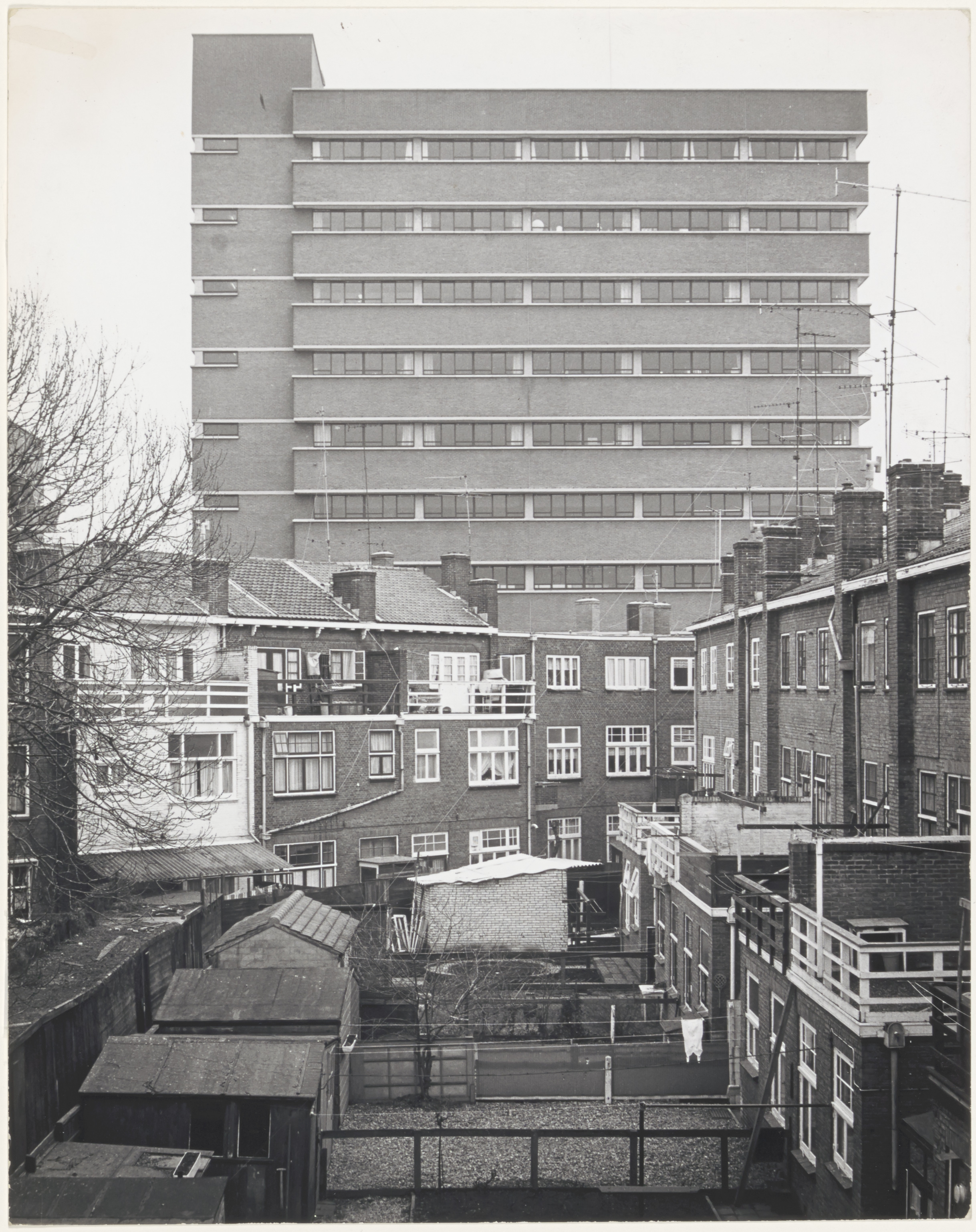 Links de achtergevels van de Nieuwe Hillstraat en rechts de achtergevels van de Spuiboulevard (vroeger Vest). Op de achtergrond hoogbouw aan het Achterom, later is ter rechter zijde hier nog een schacht aangebouwd.