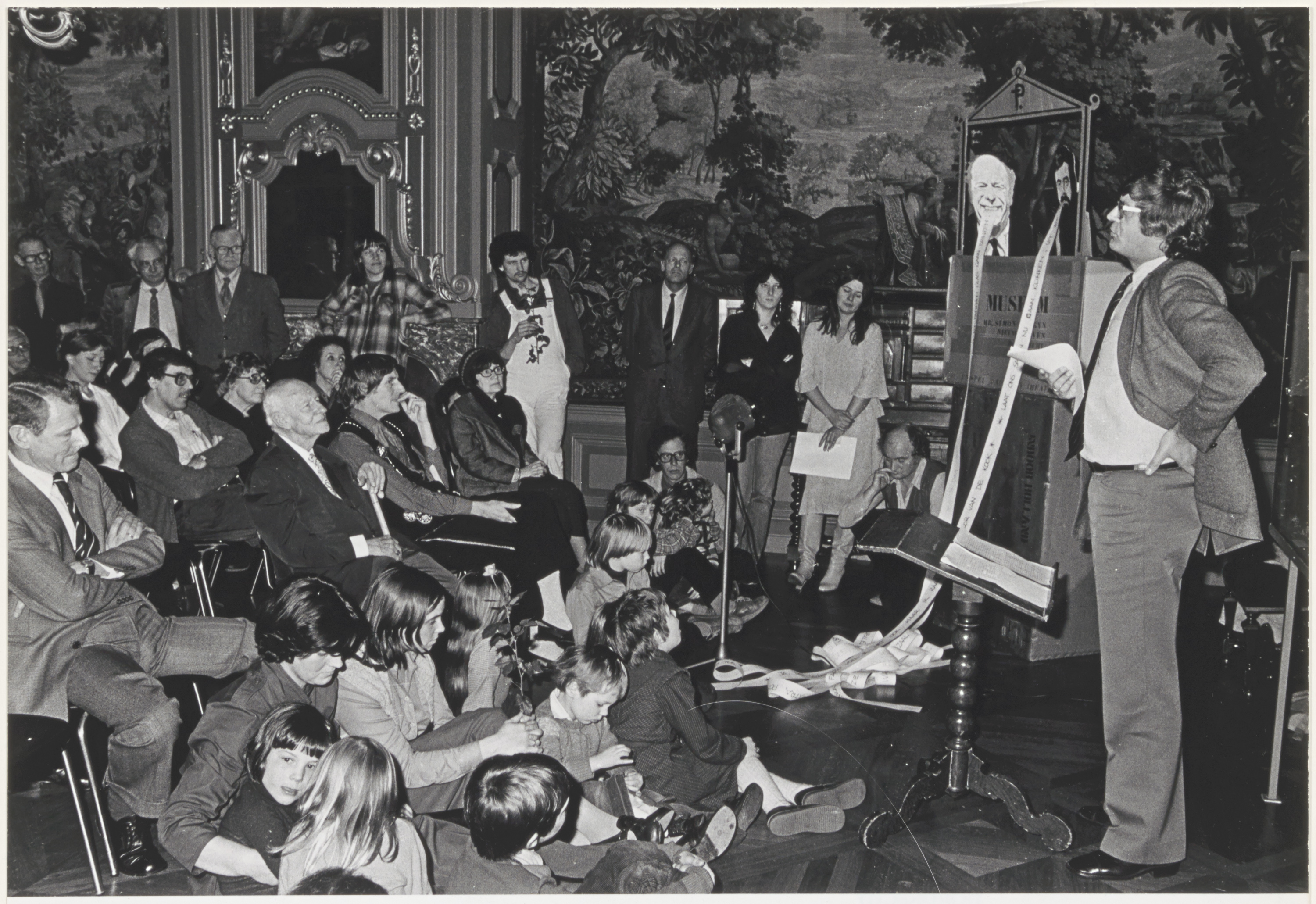 (stichting Poppenspel Centrum) --- voordracht (met publiek), poppenkast (museum mr. Simon van Gijn; lint met tekst)
