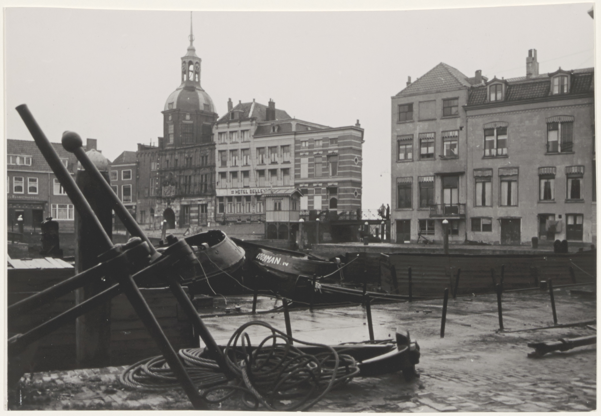 - De Wijnhaven vanaf de Taankade. Op de achtergrond v.l.n.r. de Groothoofdspoort, hotel Bellevue, de Boombrug en panden in de Boomstraat.