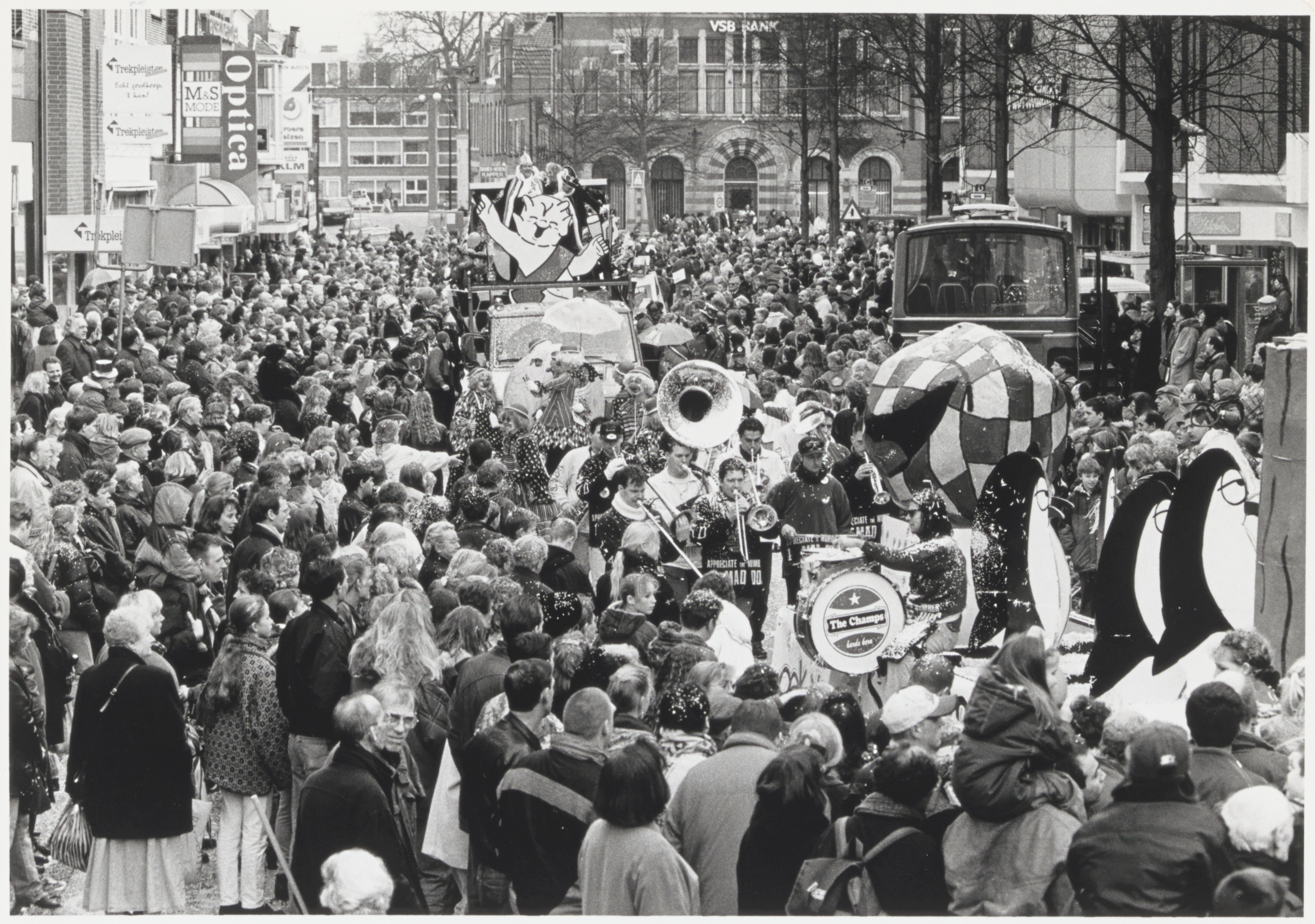 - bankgebouwen carnavals muziekbands optochten publiek / toeschouwers stadsbussen