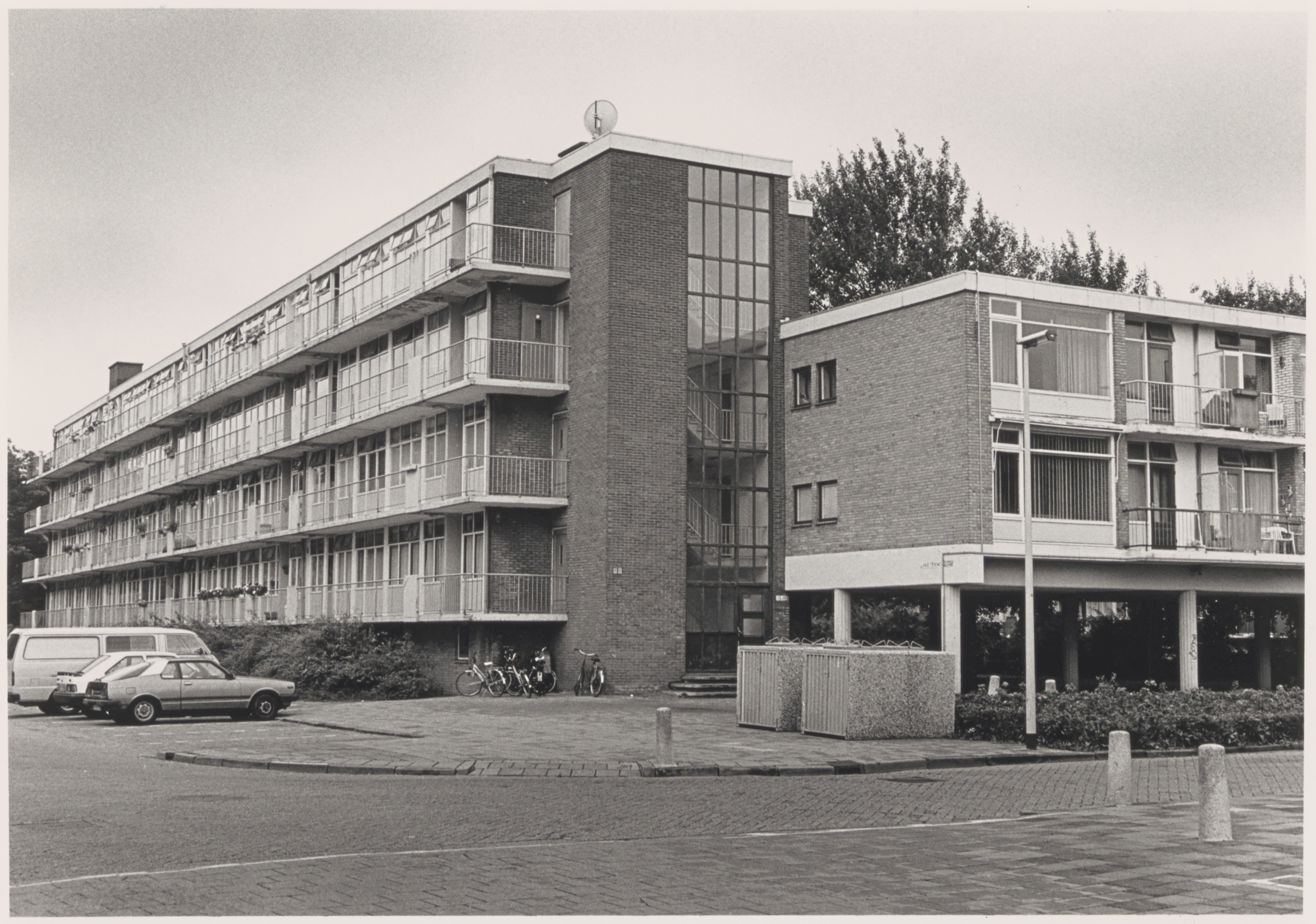 - auto's fietsen / rijwielen flatgebouwen lantaarns / straatverlichting vuilcontainers