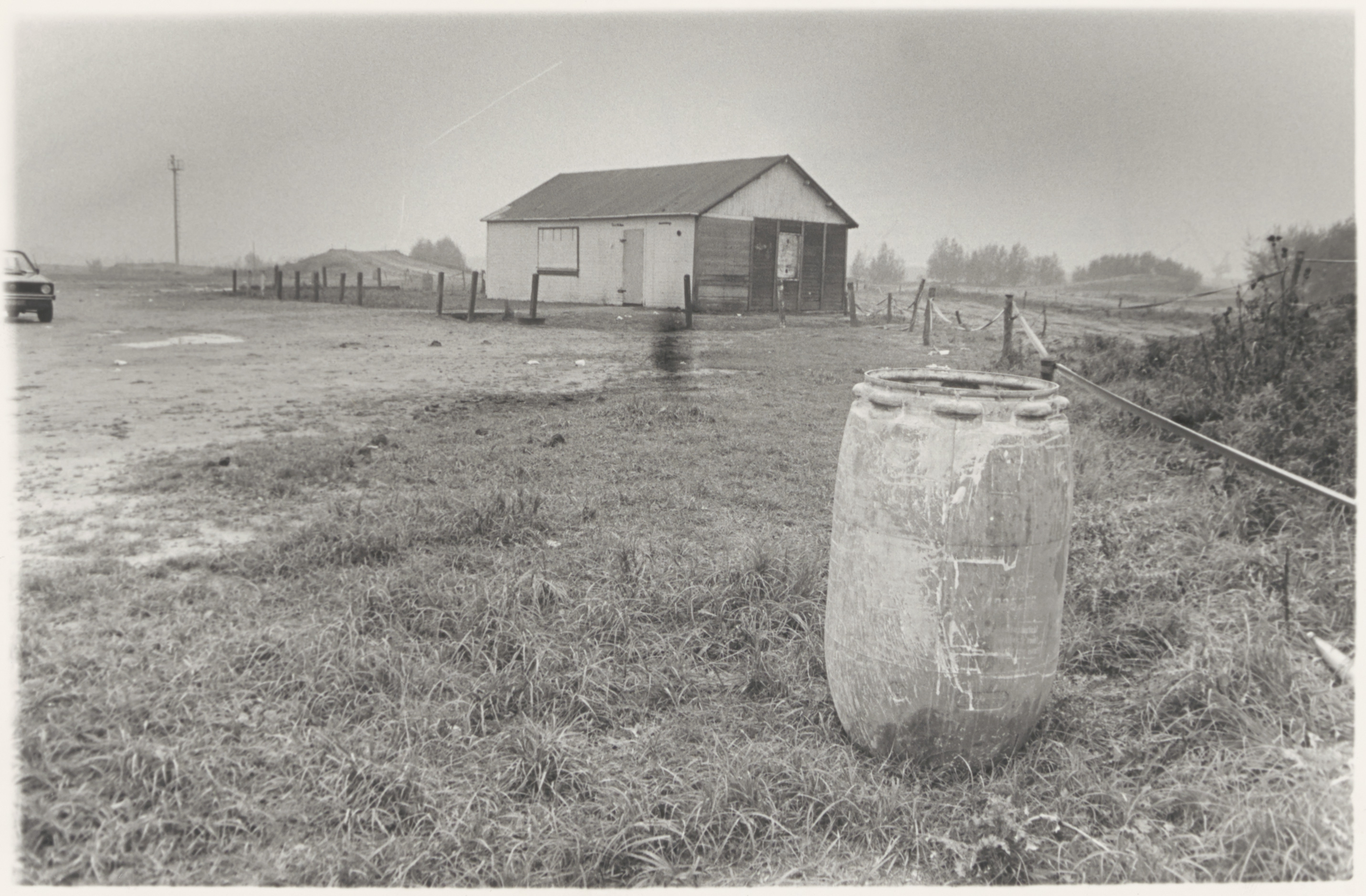 Bouwkeet in een nog onbebouwde Krabbepolder. Het gebied werd als crossterrein gebruikt.