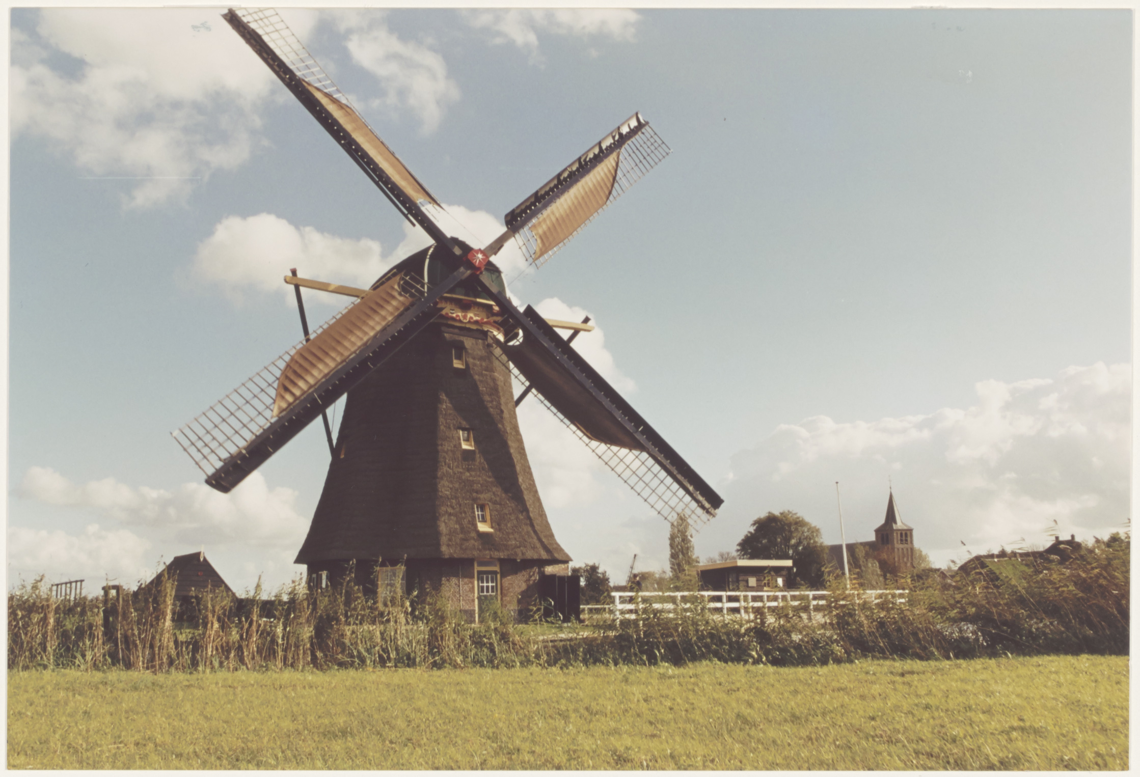 - Goudriaanse Molen aan de Molenkade in Goudriaan. Rechts de Hervormde Kerk.