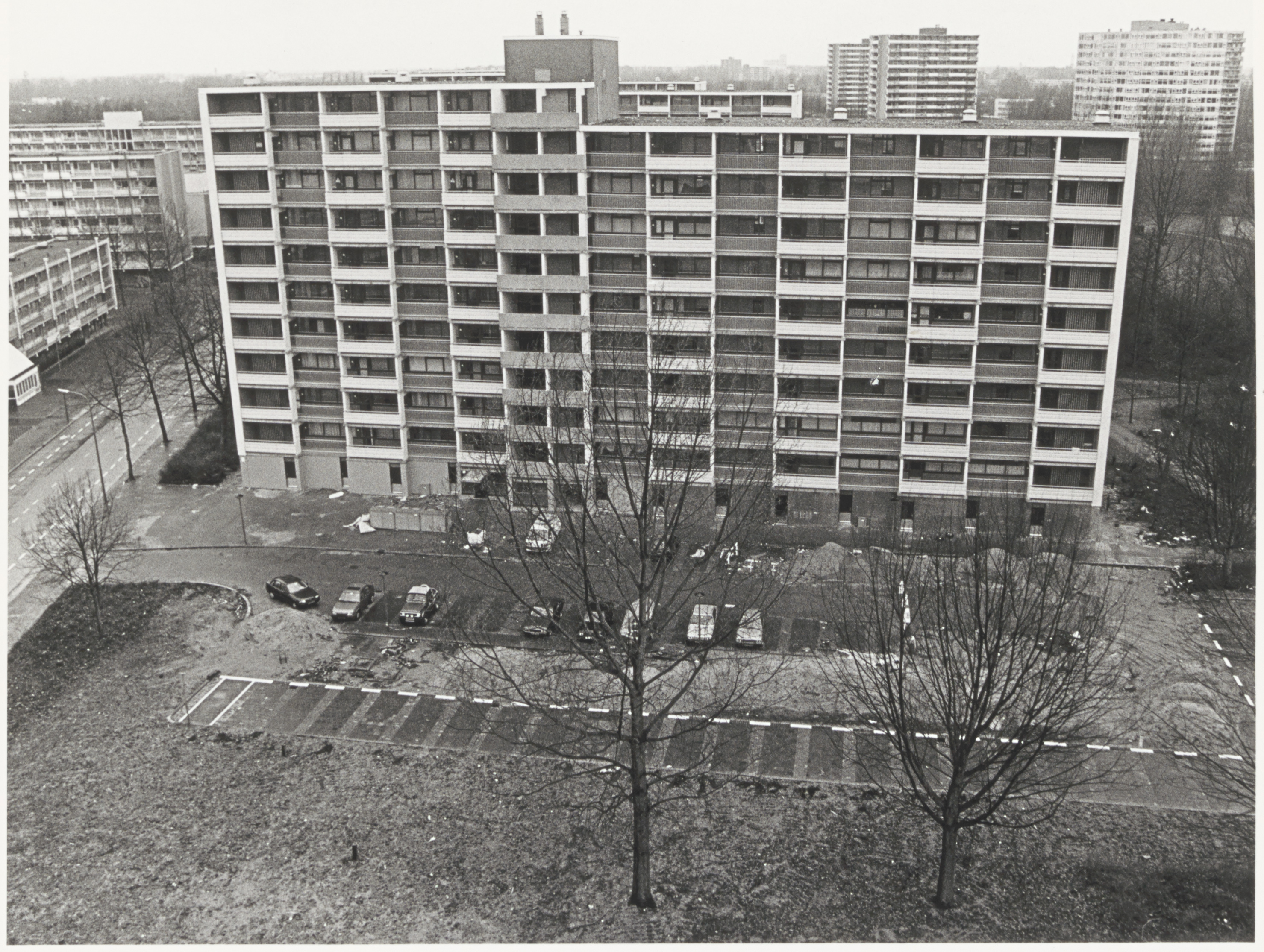 - Flatgebouw aan de Blaauwweg ter hoogte van de Heelalstraat tijdens renovatie.
