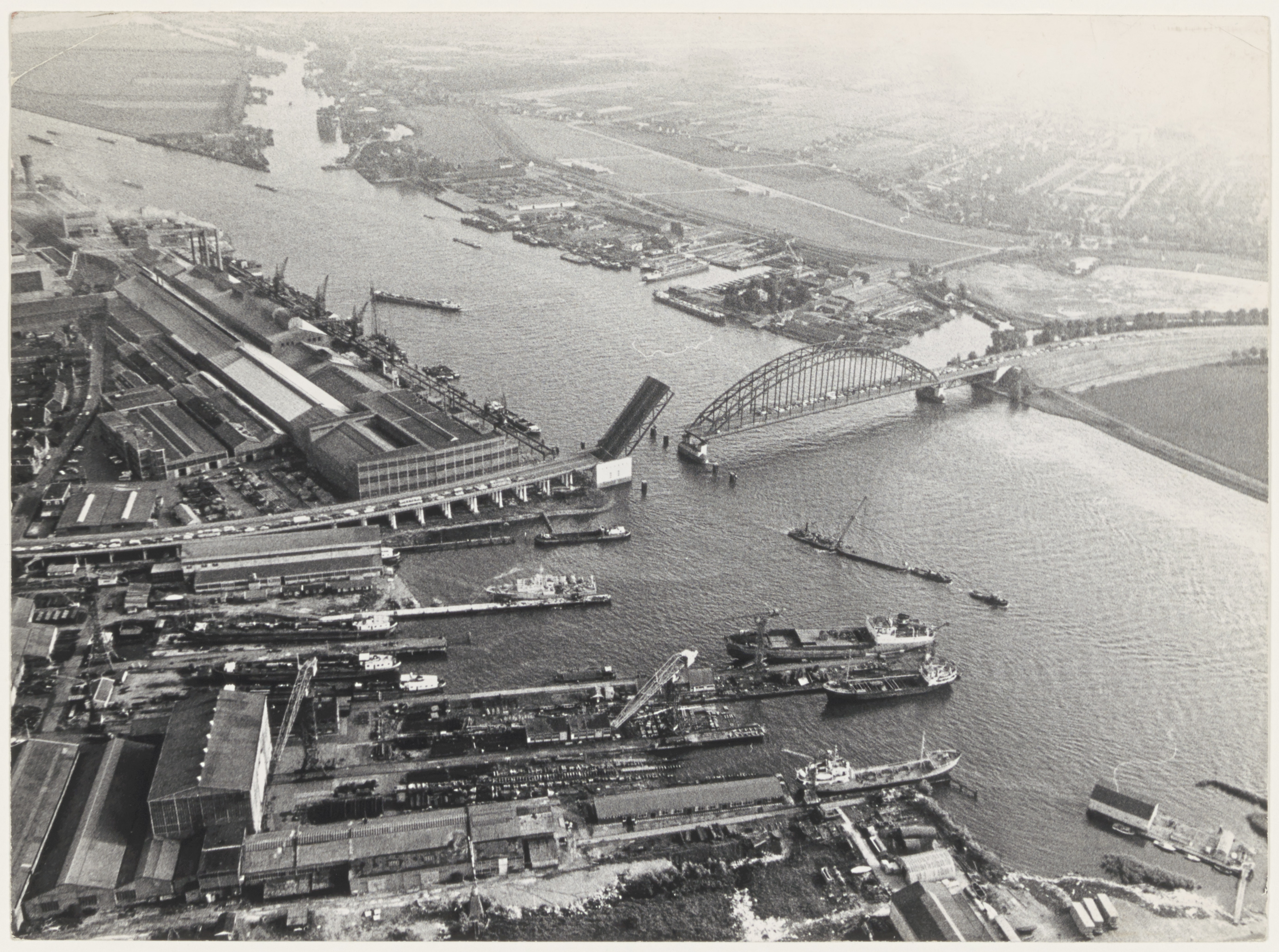 - fabrieken luchtfoto's verkeersbruggen vrachtboten