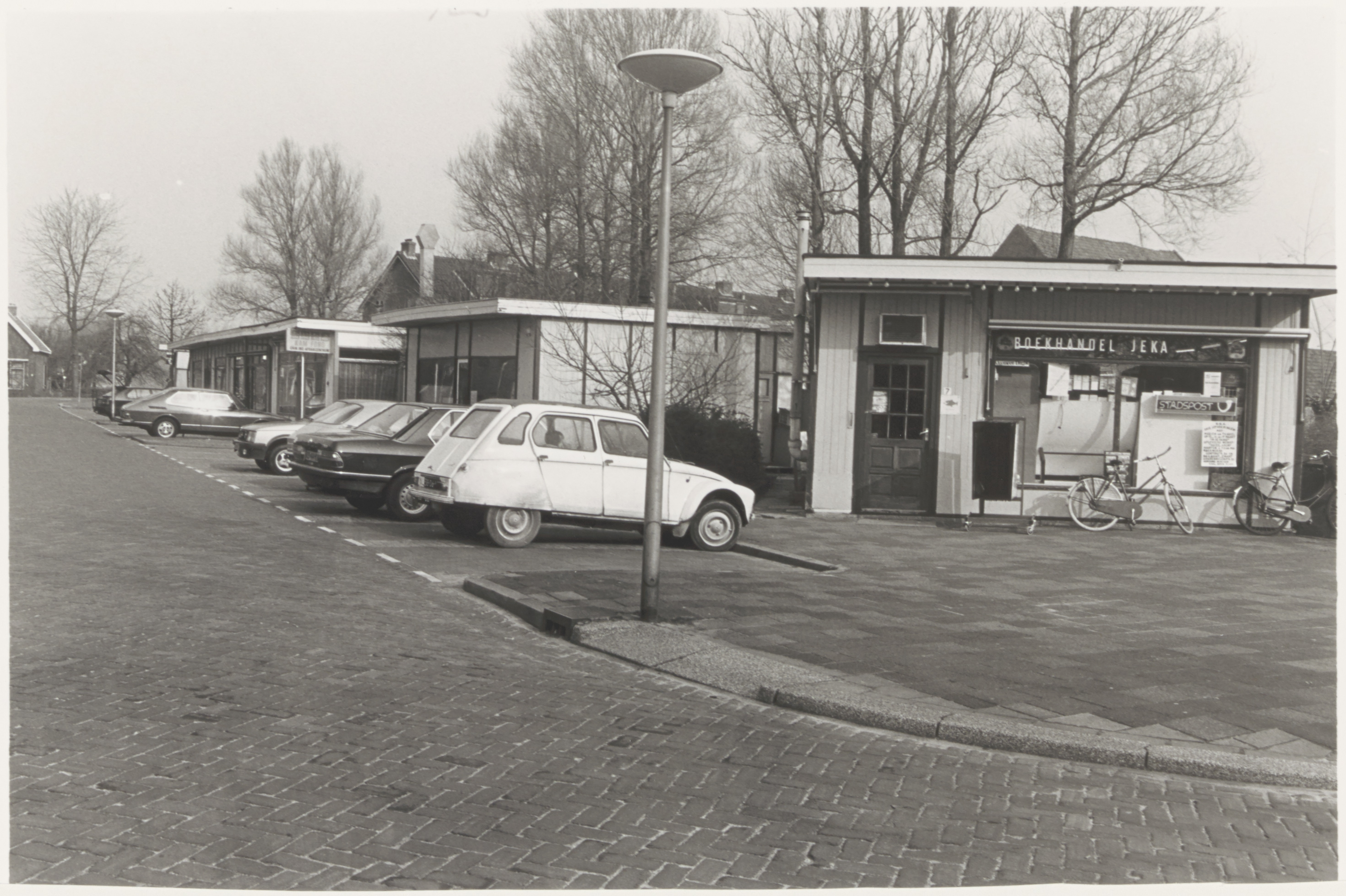 - auto's fietsen / rijwielen lantaarns / straatverlichting parkeerplaatsen winkels