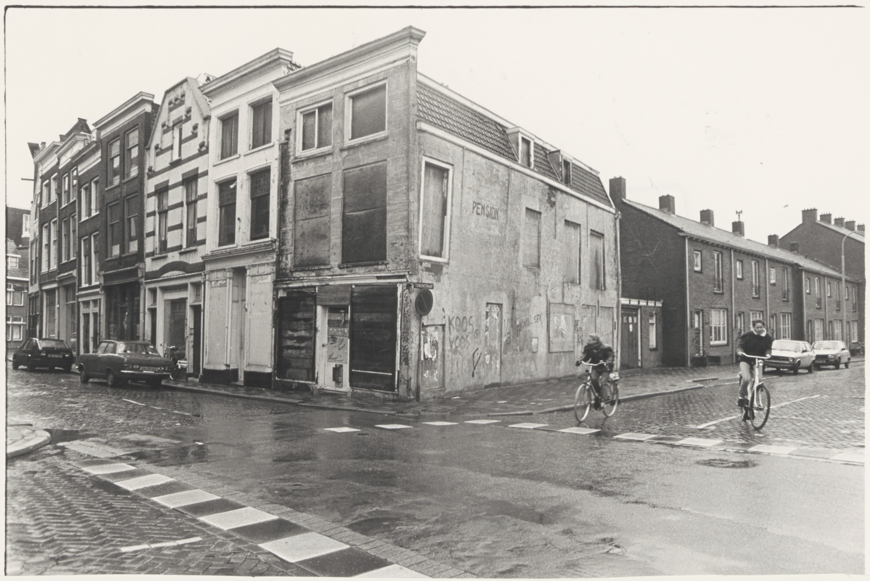 Hoek Voorstraat-Torenstraat (rechts) vanuit de Boomstraat gezien.