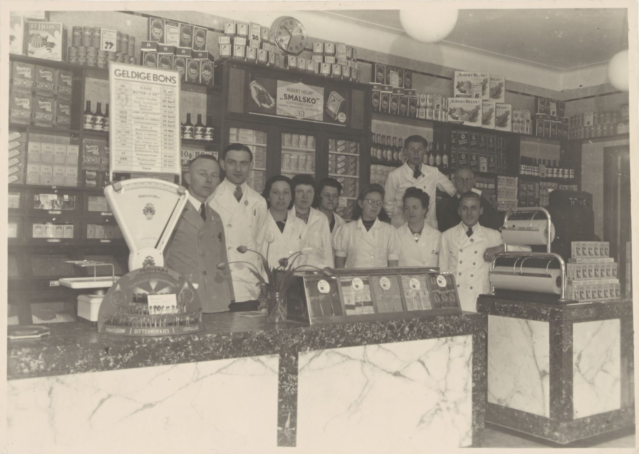 Gezien het bonnensysteem en de reclame voor koffiesurrogaat zal deze foto in of net na de oorlog zijn gemaakt. Toentertijd zat de AH in de Voorstraat, tussen de Nieuw- en Kolfstaat (zie bijv. 555_12643).