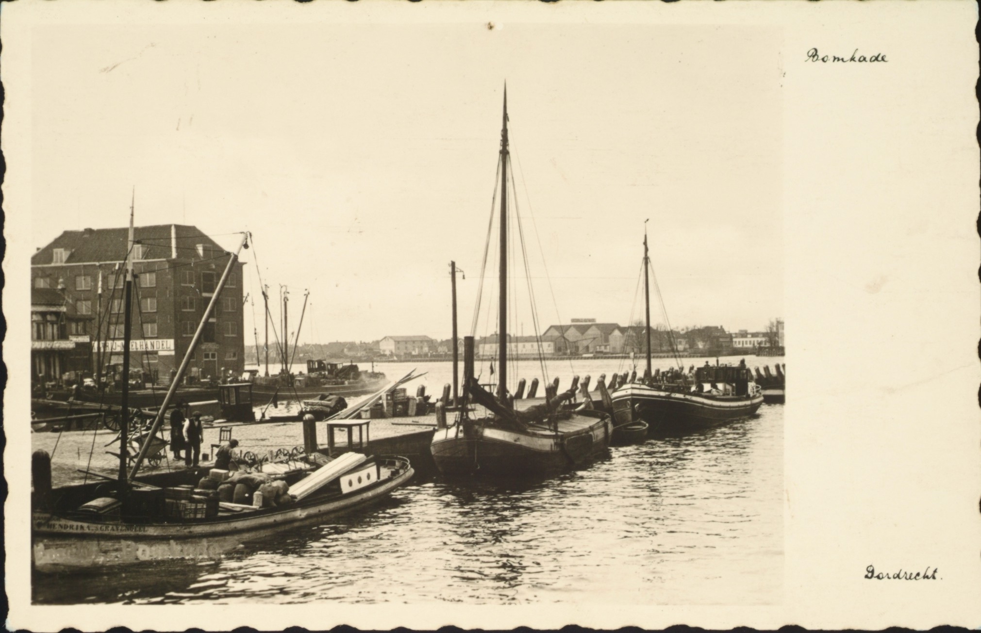 - De Bomhaven. Links pakhuis Vredenburg op de hoek van de Bomkade en de Buiten Kalkhaven.