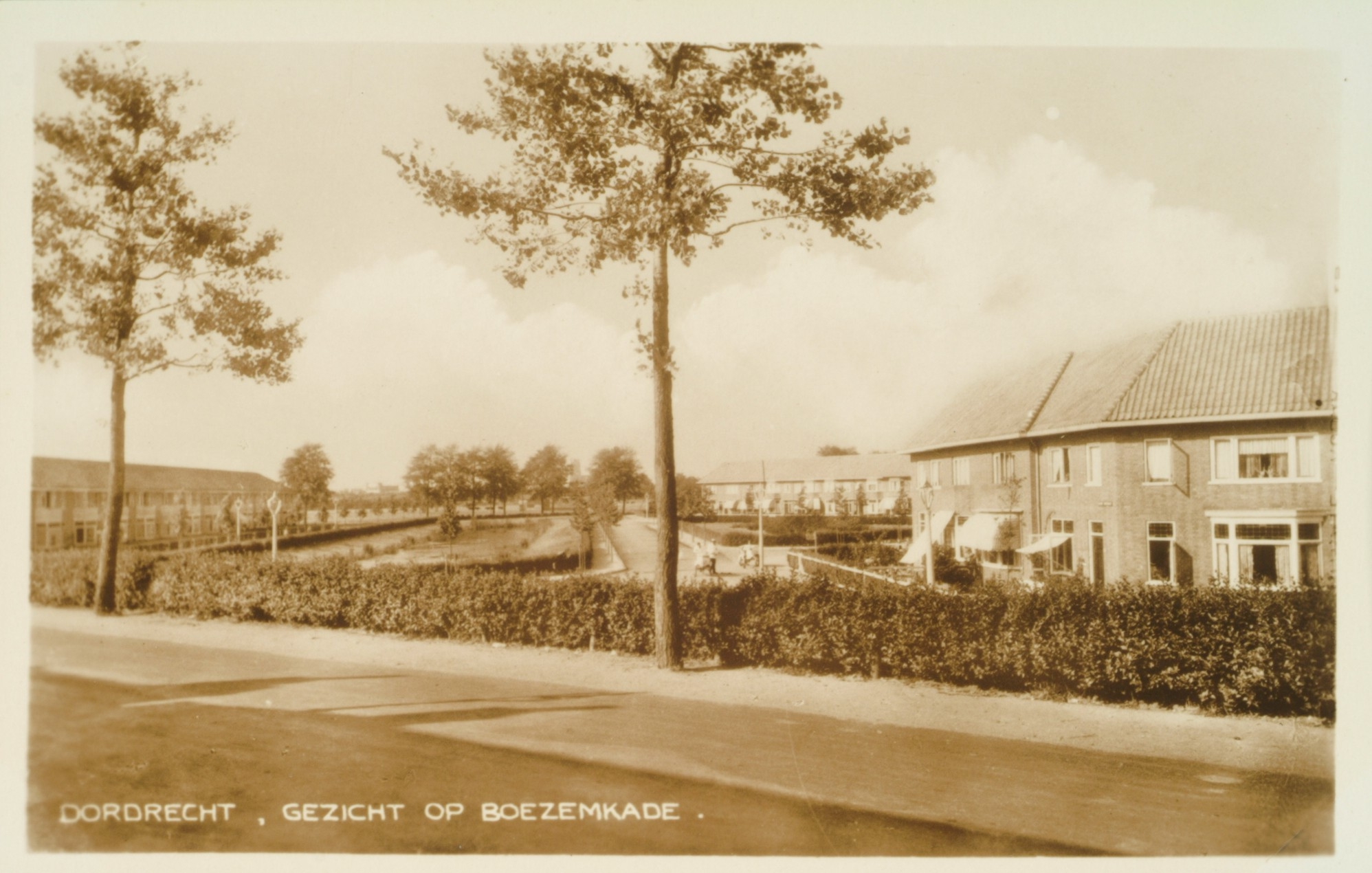 De tekst op de foto is niet geheel juist, het betreft hier namelijk de Nieuwe Boezemkade. De oorspronkelijke Boezemkade werd Jan Vethlaan genoemd en later de Frans Lebretlaan. Toen werd ook de Frans LebretSTRAAT hernoemd in Koldeweystraat. Waar we hier vanaf de Zuidendijk dus naar kijken werd in eerste instantie de Nieuwe Boezemkade genoemd en liep door tot de oorspronkelijke Boezemkade. De uitgegraven grond voor de waterpartijen is gebruikt voor het dempen van de Vuile Vliet. Met het hernoemen van de Jan Verthlaan in de Frans Lebretlaan werd ook de Nieuwe Boezemkade in Jan Vethkade hernoemd, het overige deel, vanaf de Frans Lebretlaan, wat later tot ontwikkeling kwam, in Vioattakade. Eigenlijk is het nog steeds verwarrend maar het geld en de overtuigingskracht van de zoon van Frans Lebret zorgde ervoor dat de in 1932 overeengekomen straatnamen in 1937 weer gewijzigd werden. Zie ook 555_30090.