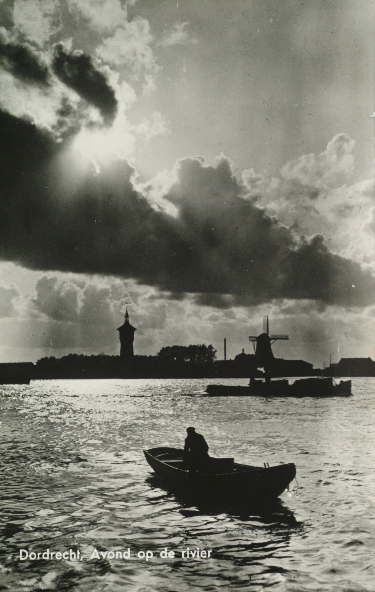 Riviergezicht over de Oude Maas met de watertoren en molen Welgelegen in Zwijndrecht op de achtergrond.