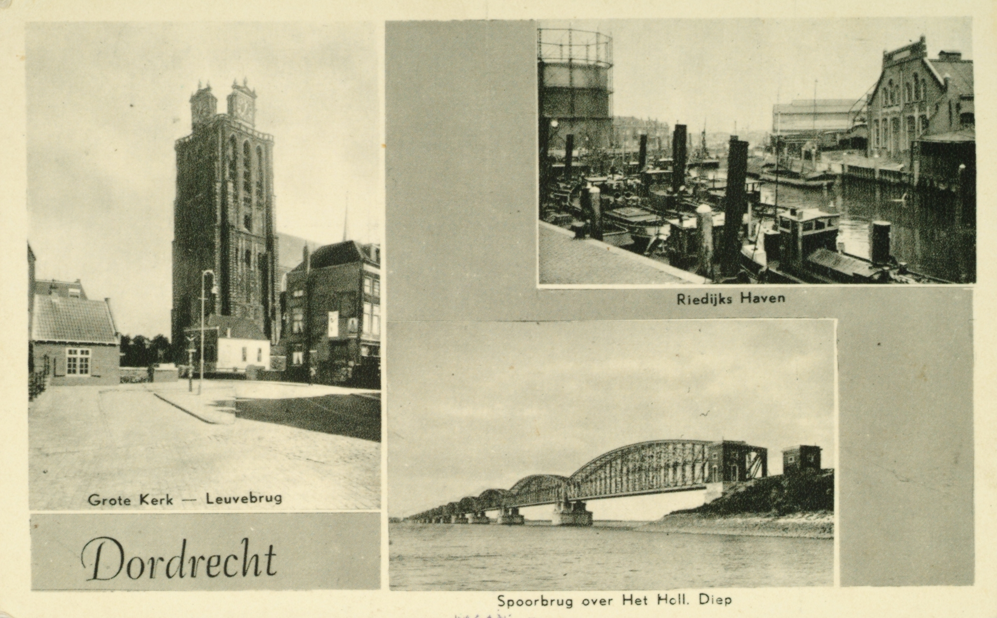 L-Leuvebrug met de Grote Kerk. RB-Riedijkshaven. RO-Spoorbrug Moerdijk.