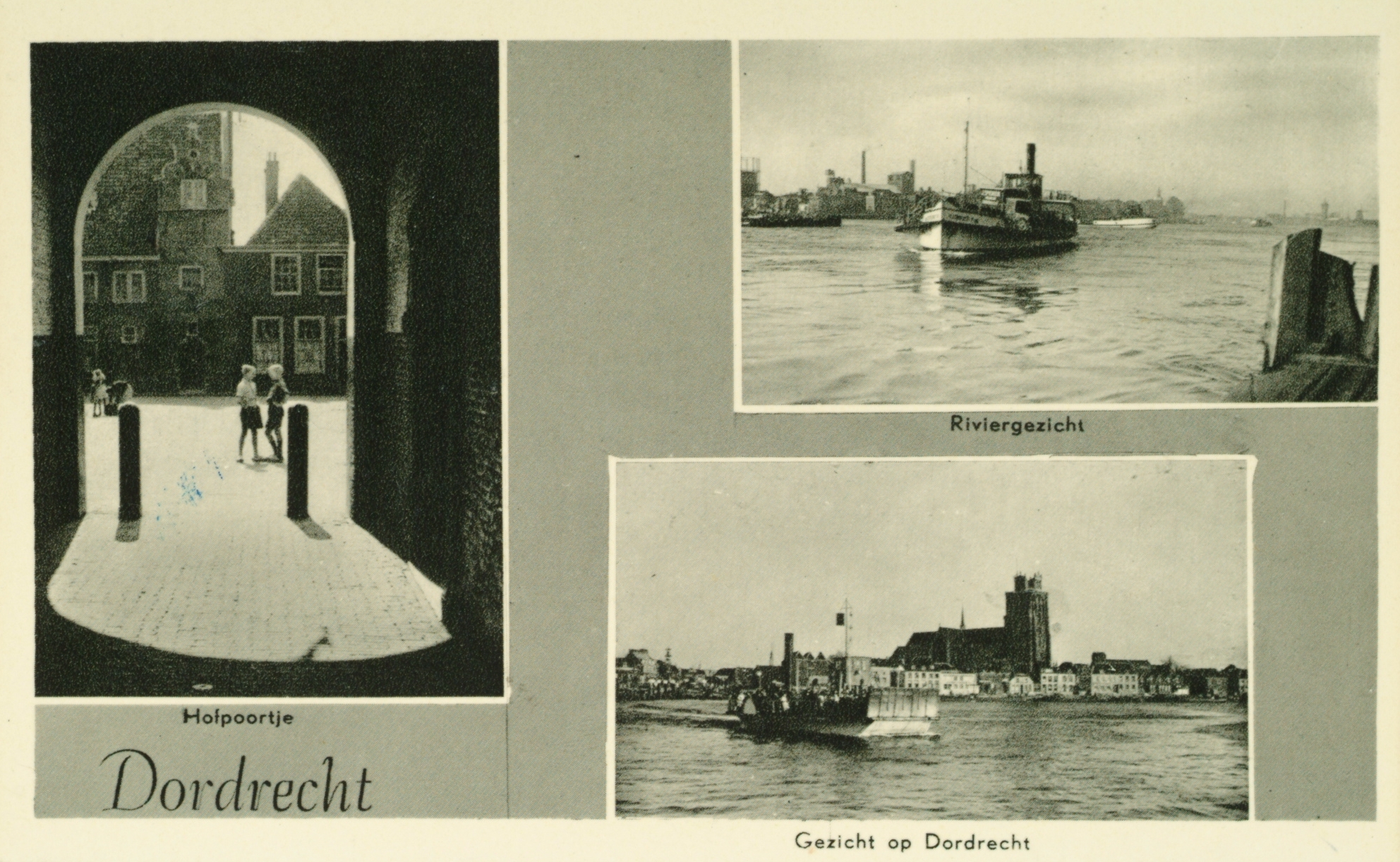 L-Hofpoortje. RB-Veerpont vanaf Papendrecht met Dordrecht op de achtergrond. RO-Veer Dordrecht-Zwijndrecht met de Grote Kerk.