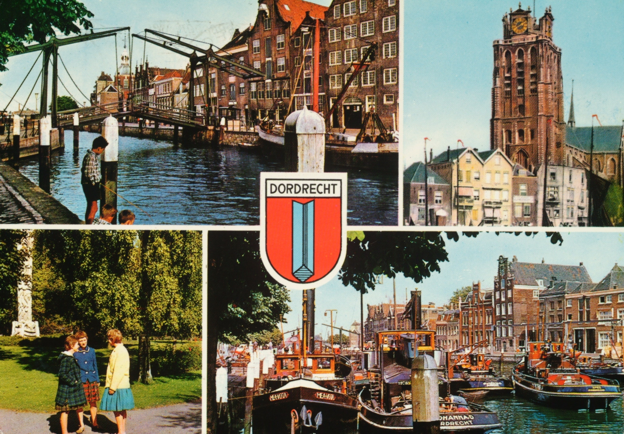 LB-Damiatebrug. RB-Grote Kerk. LO-Monument park Merwestein. RO-Wolwevershaven.
