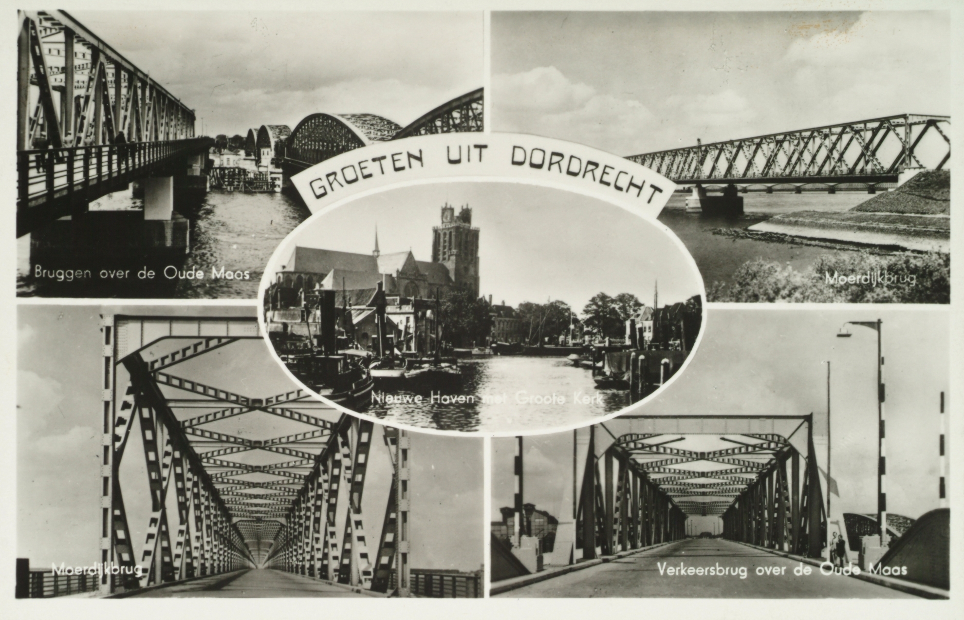 LB-Bruggen over de Oude Maas. RB-Moerdijkbrug. M-Nieuwe Haven met de Grote Kerk. LO-Moerdijkbrug. RO-Verkeersbrug over de Oude Maas.
