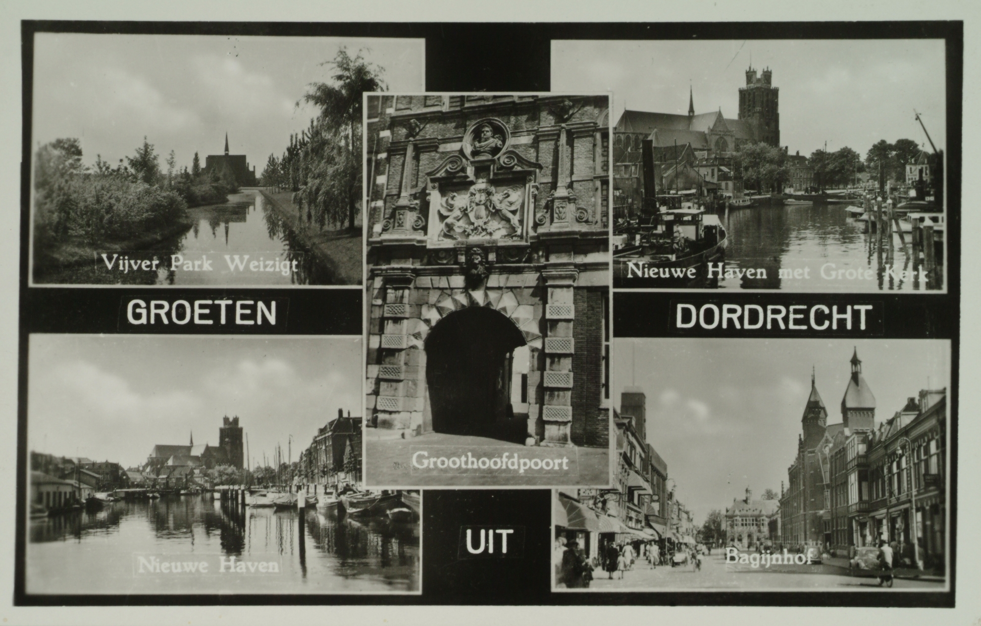 LB-Park Weizigt met de Julianakerk. RB-Nieuwe Haven met de Grote Kerk. LO-Nieuwe haven met de Grote Kerk. RO-Bagijnhof met het Postkantoor. M-Groothoofdspoort.
