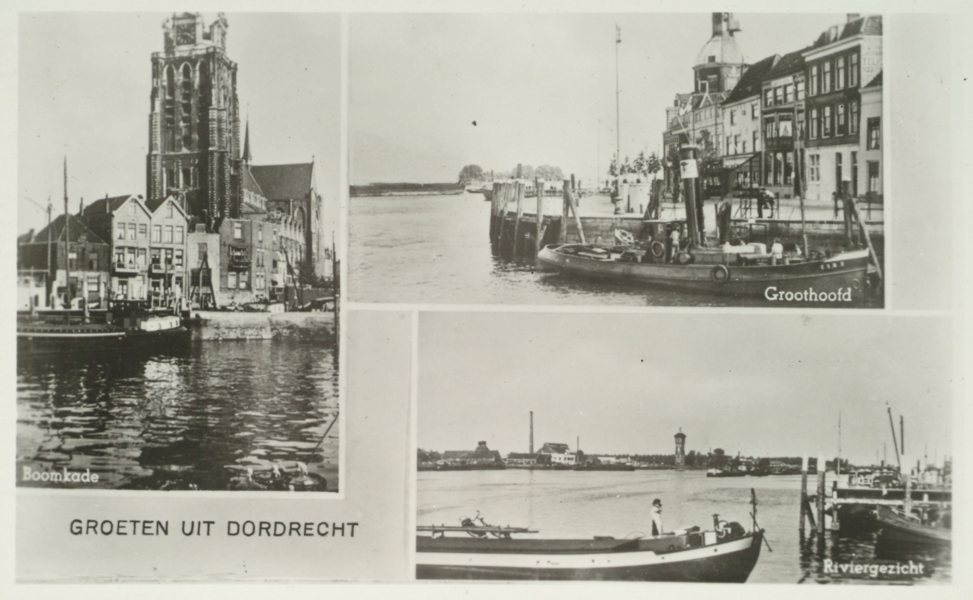 LB-Bomkade met de Grote Kerk. RB-Groothoofd. RO-Riviergezicht Oude Maas met Zwijndrecht op de achtergrond.